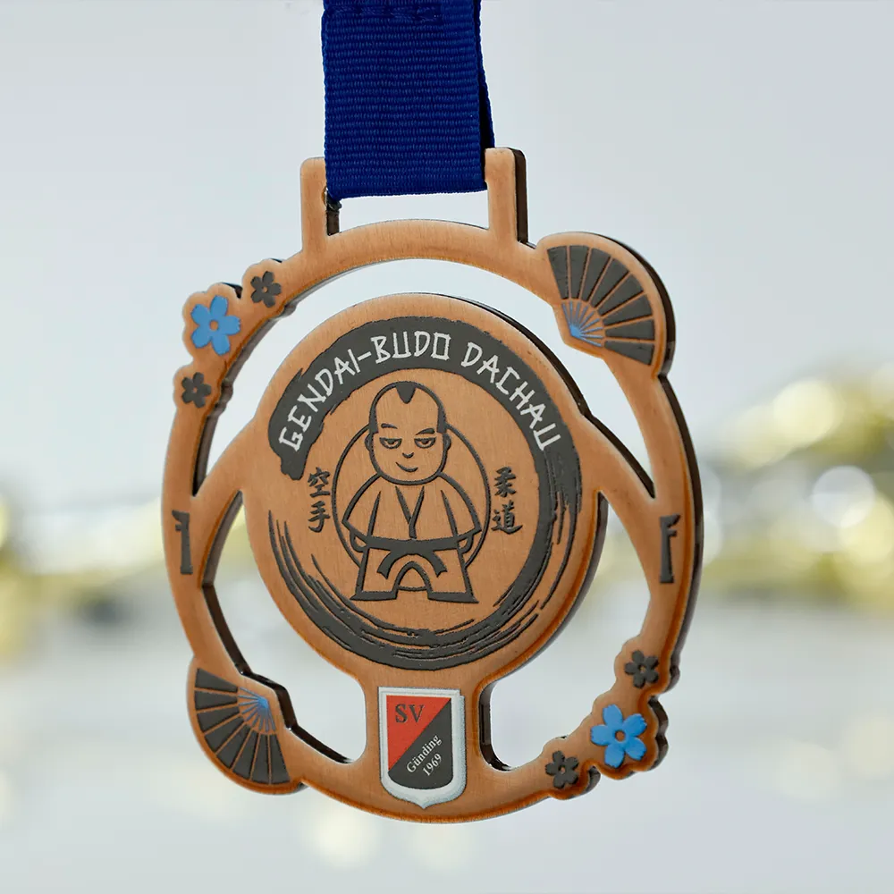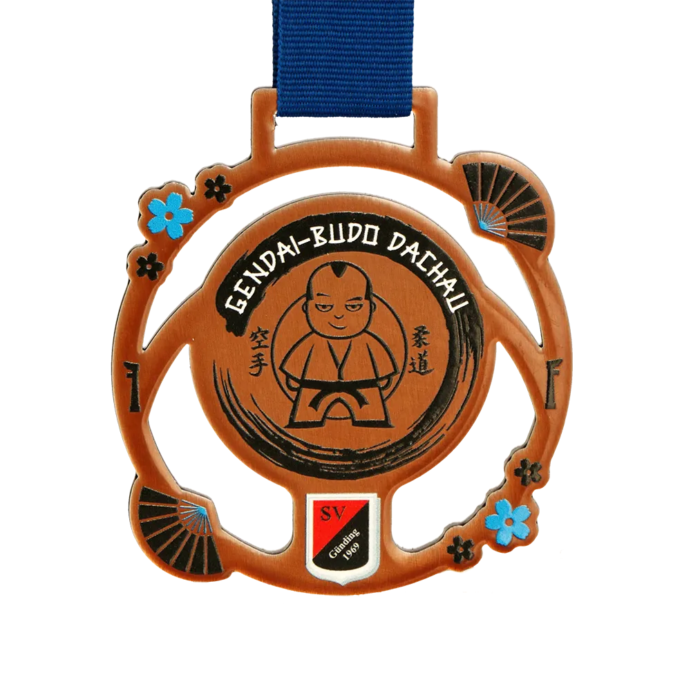 Se diseñó una medalla de acero con impresión UV para Gendai-Budo Dachau. Con forma calada a medida y corte láser, luce un acabado color cobre. El elemento central, impreso en UV, representa una figura con gi y el nombre del club. Es un ejemplo de cómo una medalla personalizada se fabrica específicamente para clubes deportivos y torneos de judo.