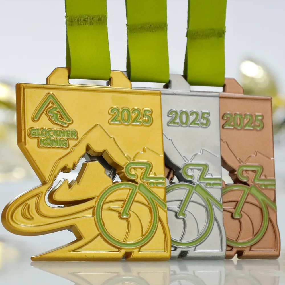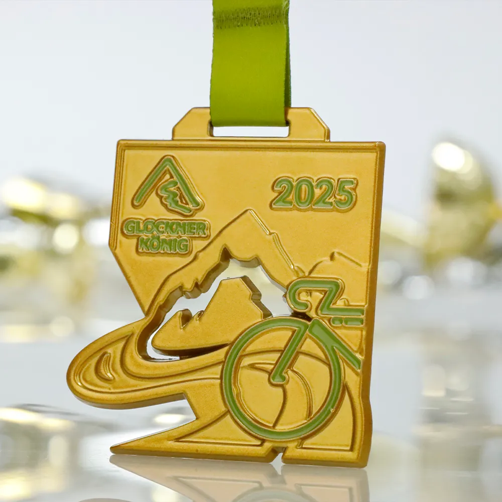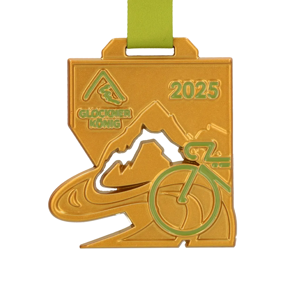 Esta medalla fundida se realizó para la carrera ciclista Glocknerkönig 2025. De forma geométrica a medida, se funde y posteriormente se termolaca en color dorado. En el anverso domina la iconografía de las pruebas de montaña: silueta de cumbre, río descendente y contorno de bicicleta en esmalte verde. Medalla destinada a un evento de ciclismo.