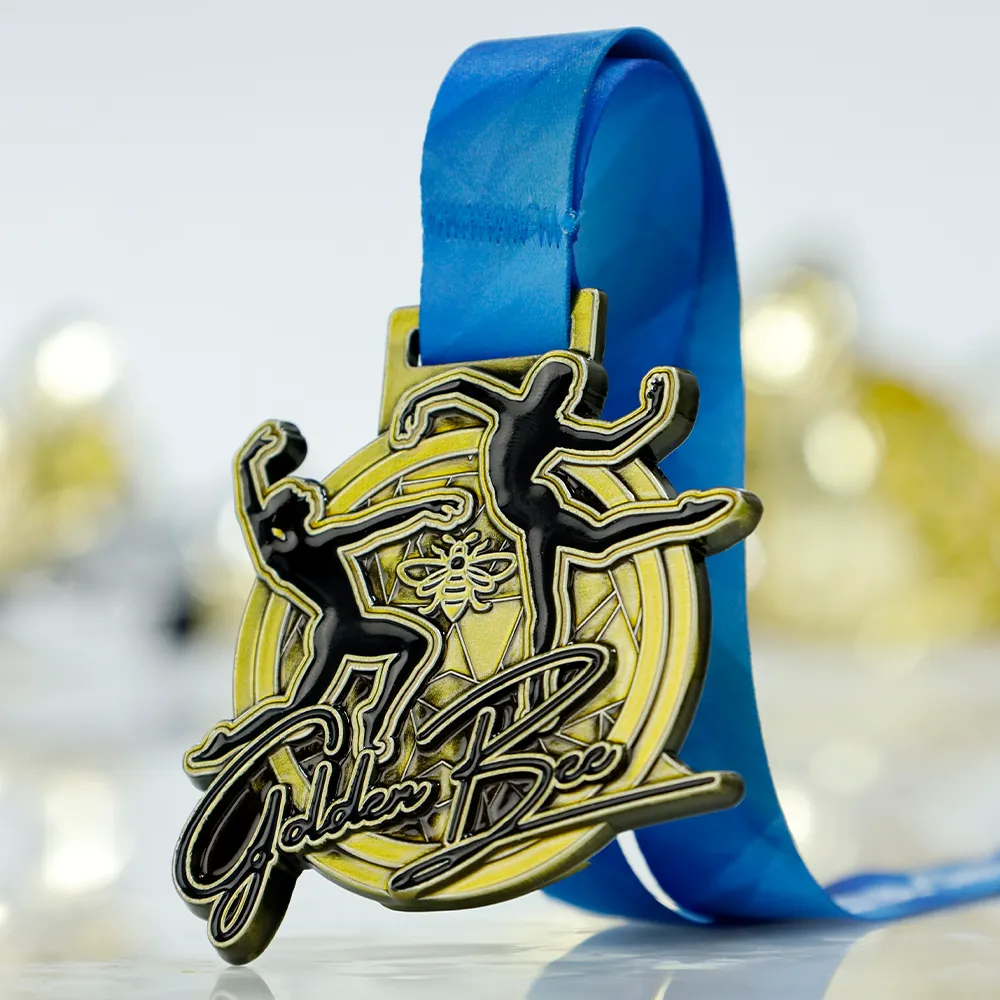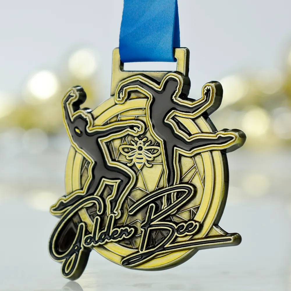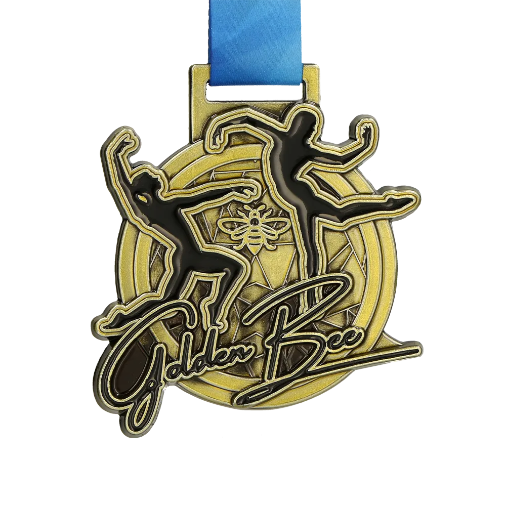 Medalla fundida en tonos dorados con siluetas dinámicas de bailarines y el símbolo central de una abeja. Medalla 2D con esmalte negro en algunos elementos. Personalizada con el nombre Golden Bee en el frente.