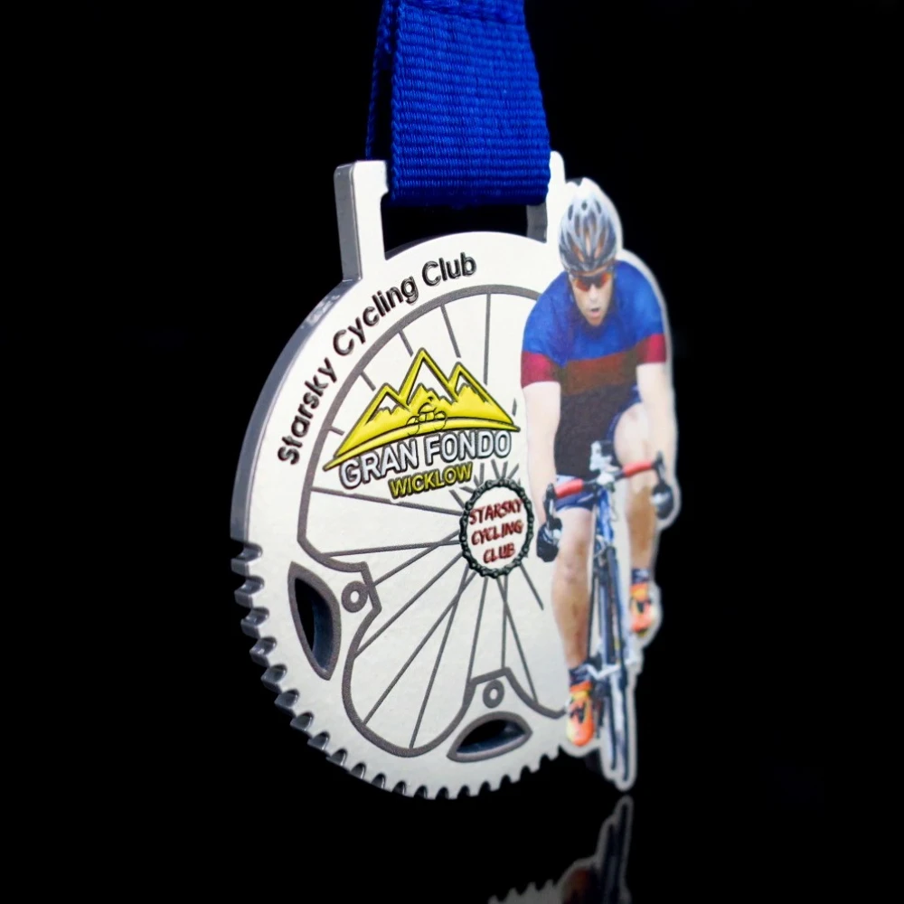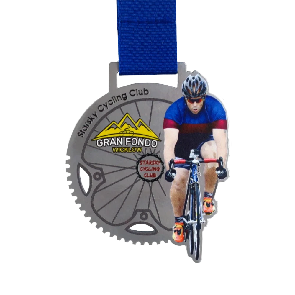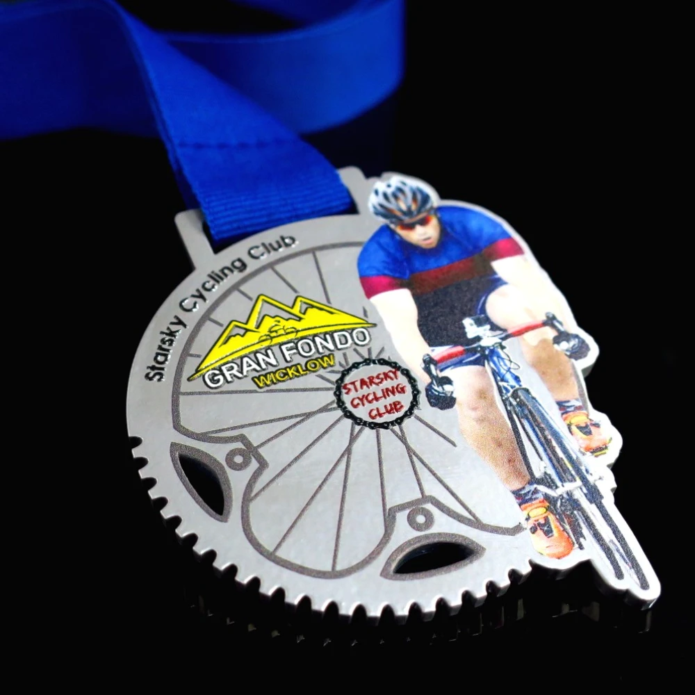 Para responder a las tendencias cambiantes y a las crecientes expectativas de los clientes, elaboramos medallas utilizando tecnología de corte por láser. La medalla de acero diseñada para el evento Gran Fondo Wicklow es un ejemplo perfecto del uso de esta tecnología. Esta medalla presenta una forma atractiva con varios detalles, como pequeños elementos calados y un patrón de piñón en la parte inferior. Además, la figura de un ciclista impresa a color encaja perfectamente con el ambiente de la carrera ciclista. Asimismo, nuestras medallas personalizadas destacan gracias a una capa de barniz transparente que añade un toque de elegancia.