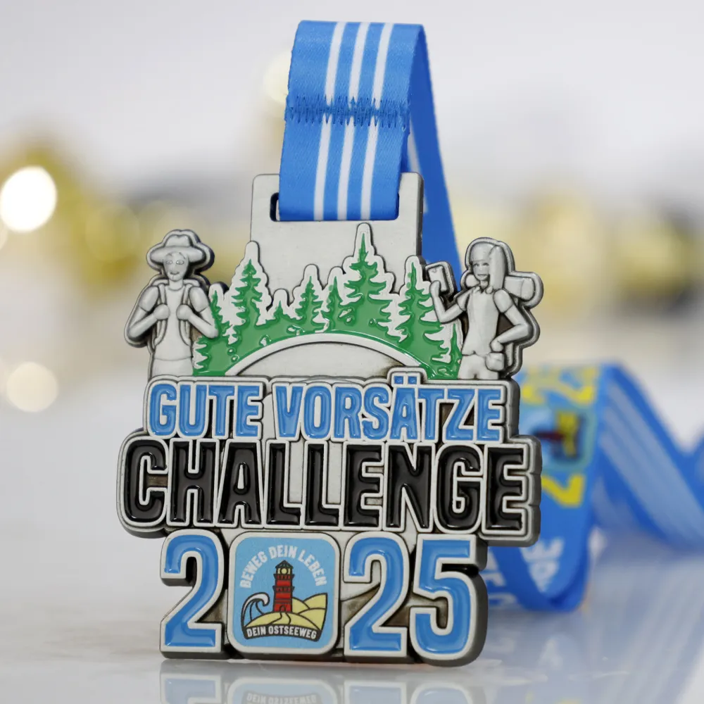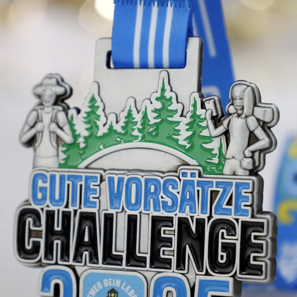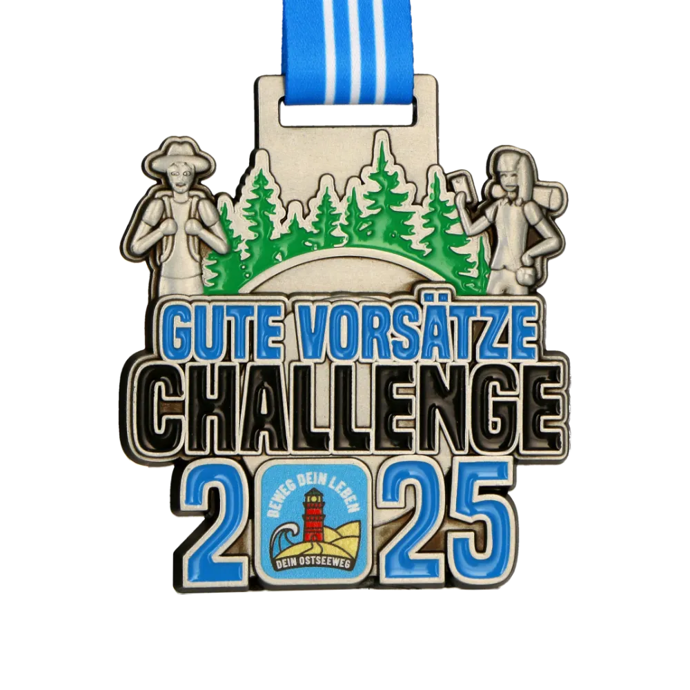 Unas medallas de medalla personalizada creadas para la “Gute Vorsätze Challenge 2025” llaman la atención por su superficie plateada y un marcado motivo verde de bosque. Los elementos personalizados, como la inscripción del evento y un emblema de faro, enfatizan el carácter único de la carrera. Una cinta azul a rayas garantiza una sujeción cómoda y completa la estética coherente.
