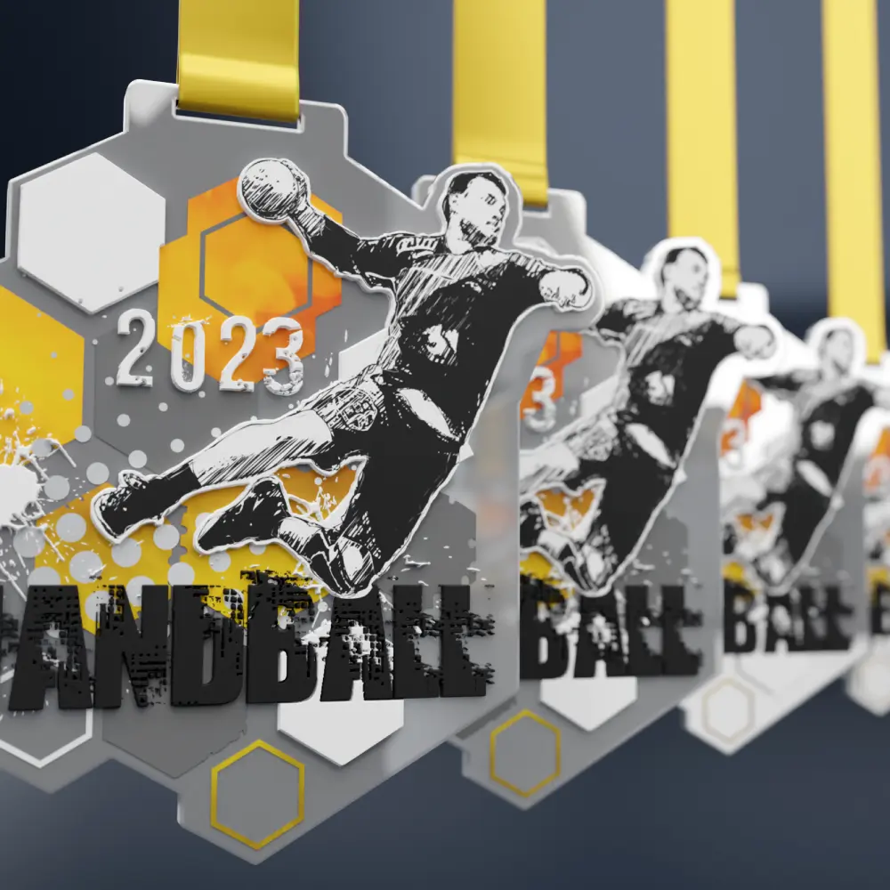 Imagina una medalla metálica que no solo premie la victoria, sino que también capture por completo el intenso espíritu del balonmano. Nuestra última colección está compuesta por medallas de acero cortadas con precisión, que encajan perfectamente en el emocionante mundo de este deporte. Con formas creativas y detalles únicos que van más allá de las formas circulares tradicionales, las medallas de la Handball League destacan frente a los premios estándar. Las medallas están cubiertas de color plata, en contraste sutil con la impresión multicolor que rinde homenaje al balonmano mediante gráficos que reflejan su dinamismo y energía. El efecto general se realza con el uso de elementos de impresión 3D que aportan profundidad. Además, las medallas se presentan con trofeos, aumentando su atractivo.