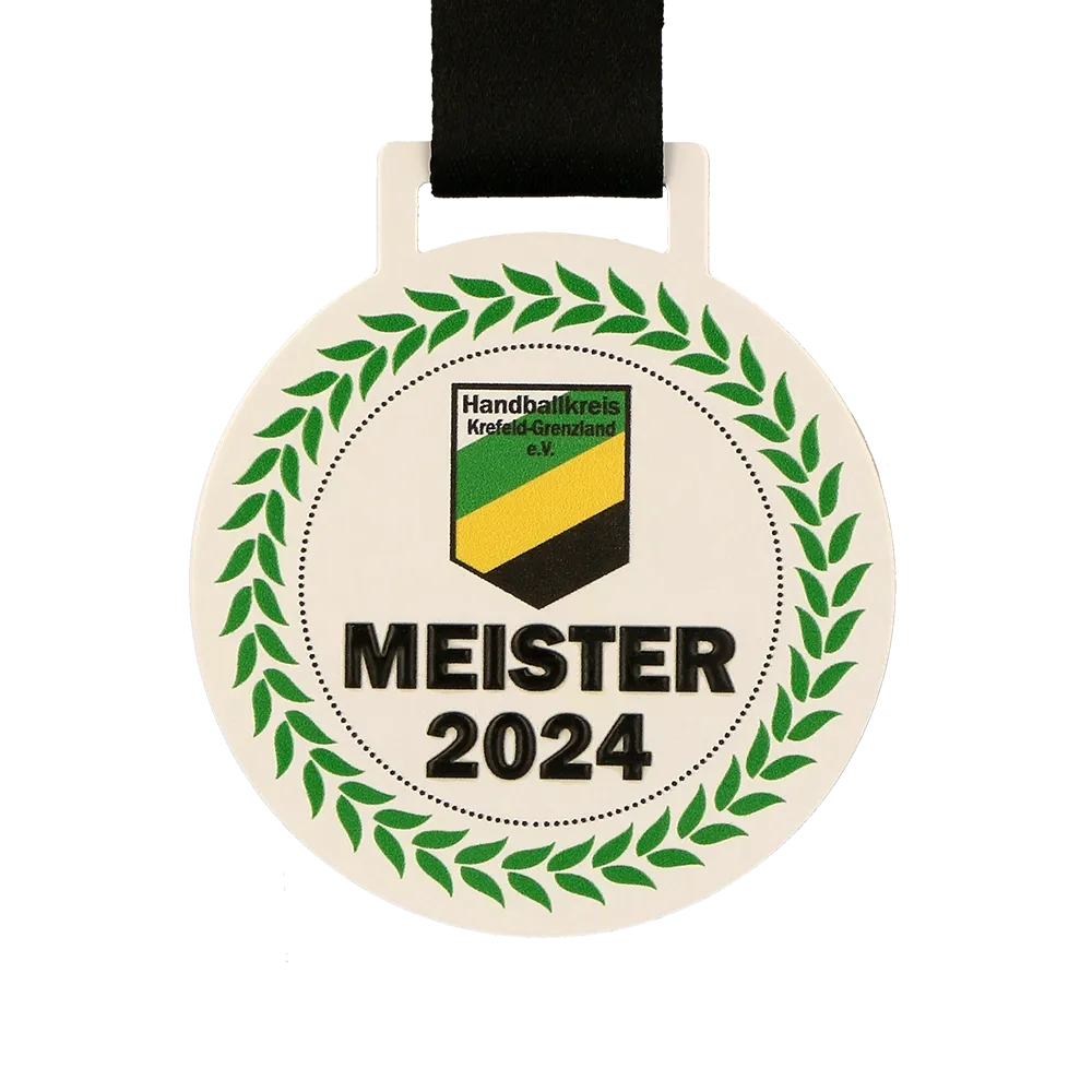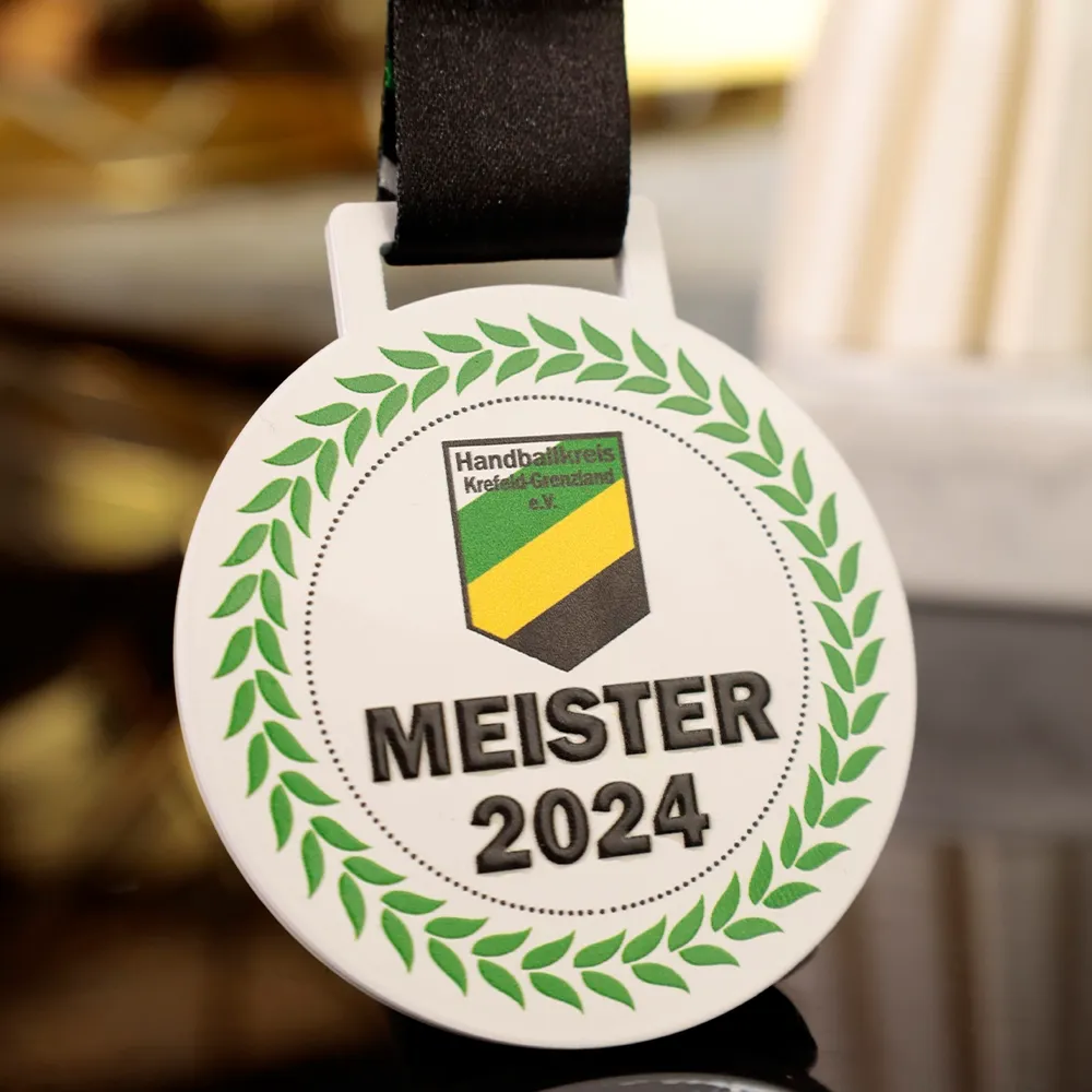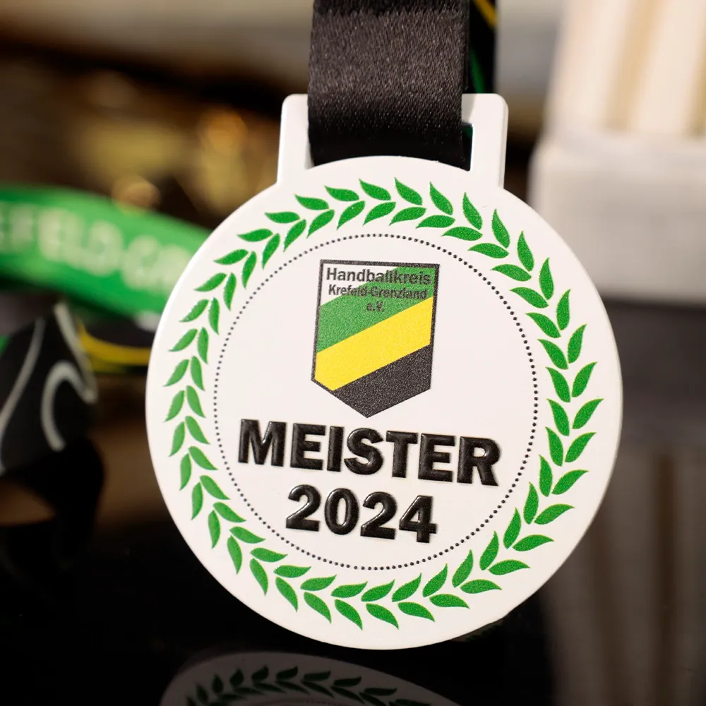 Una medalla personalizada creada para el Handballkreis Krefeld-Grenzland. La medalla tiene forma clásica y redonda. Su simplicidad y simetría le dan un carácter atemporal. En el centro se encuentra el logotipo del organizador.
