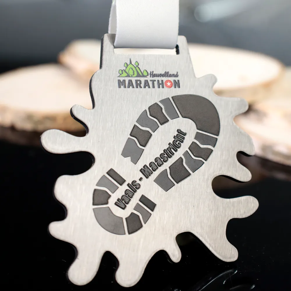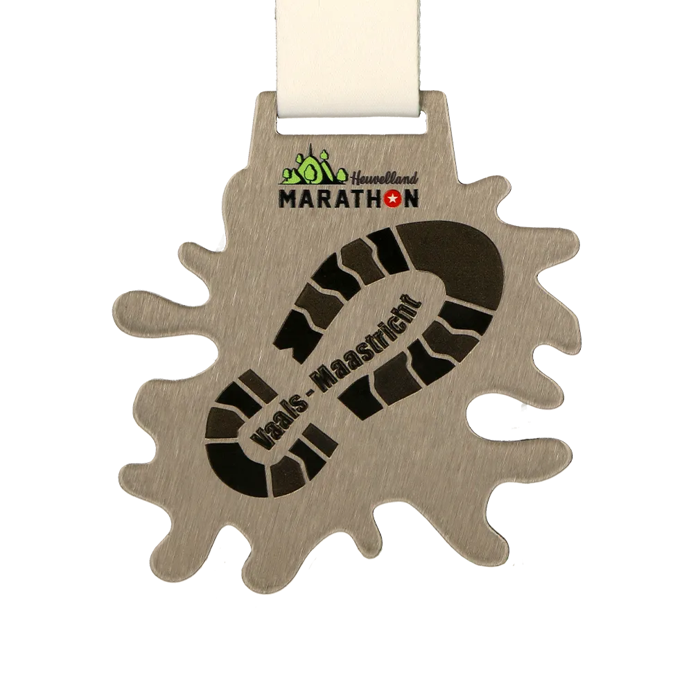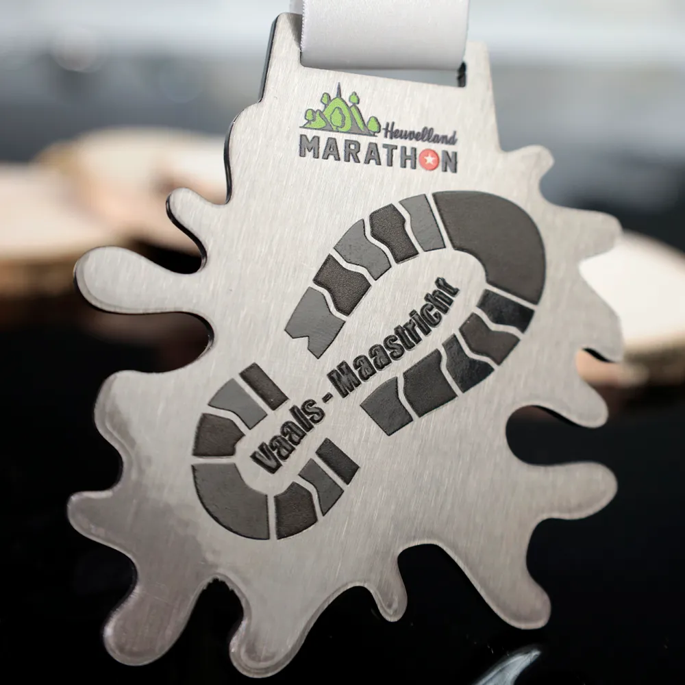 A running medal for participants of the Heuvelland Marathon. The medal has a unique shape and features a printed footprint using UV printing. The solid design and detailed execution highlight the prestige and challenge of this race. An ideal choice for marathon organisers.
