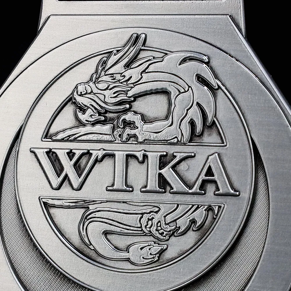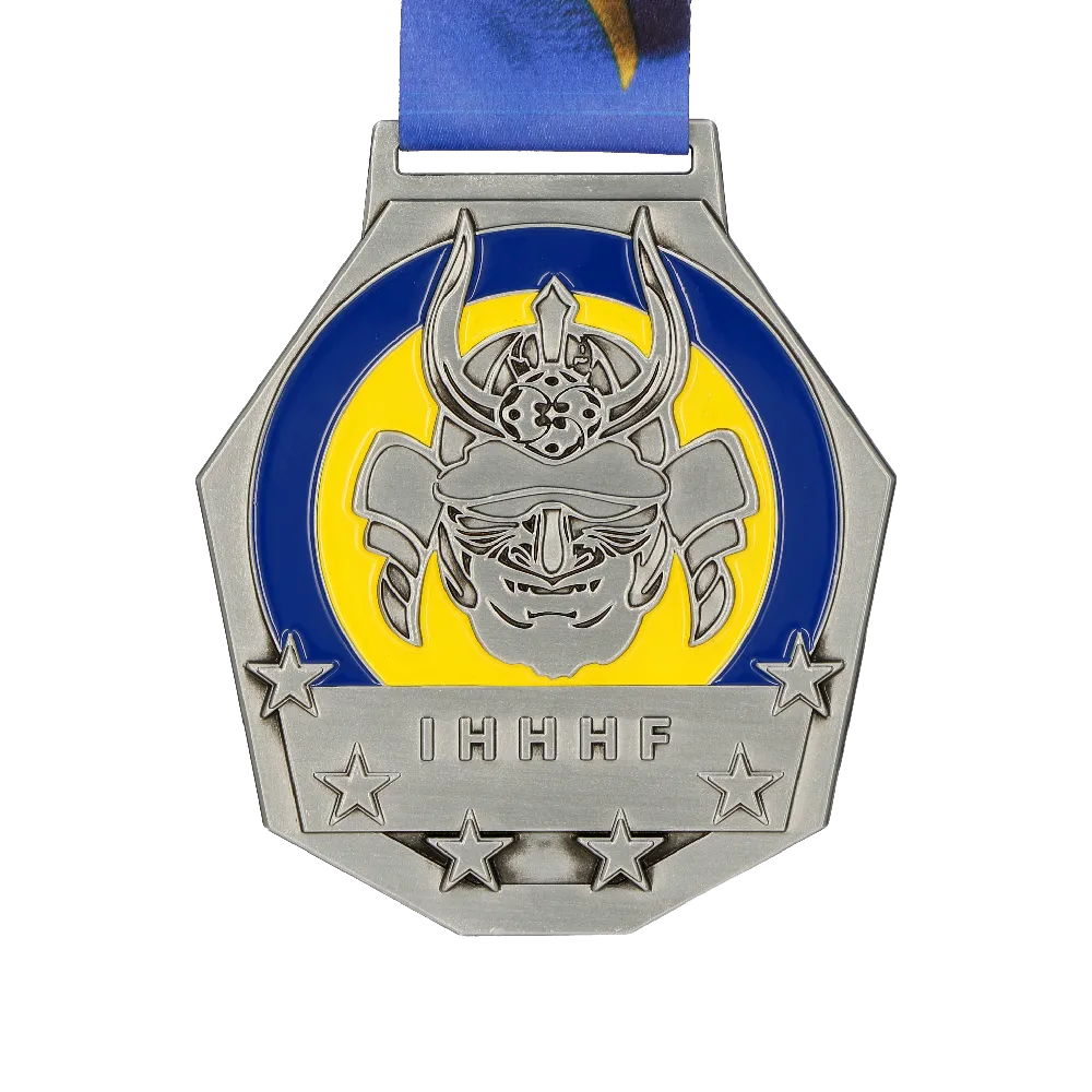 Las artes marciales son una disciplina muy antigua que se ha desarrollado prácticamente en todos los rincones del mundo. Por ello, la popularidad de los deportes de combate es extremadamente alta. Esto se refleja, por ejemplo, en el número de eventos deportivos organizados. Uno de ellos es el I.H.H.H.F. European Championships, donde los participantes tuvieron la oportunidad de ganar exclusivas medallas personalizadas preparadas por nuestra empresa. Fabricamos completamente las medallas fundidas, que se distinguen por su forma geométrica y decoraciones tridimensionales. Además, son medallas de doble cara, lo que significa que los elementos decorativos están presentes en ambos lados. El anverso presenta un gran retrato de la cabeza de un guerrero, rodeado de esmalte bicolor. En el reverso colocamos el logotipo de un dragón con una reproducción perfectamente lograda. Todo ello se complementa con una cinta de sublimación personalizada de diseño elegante.