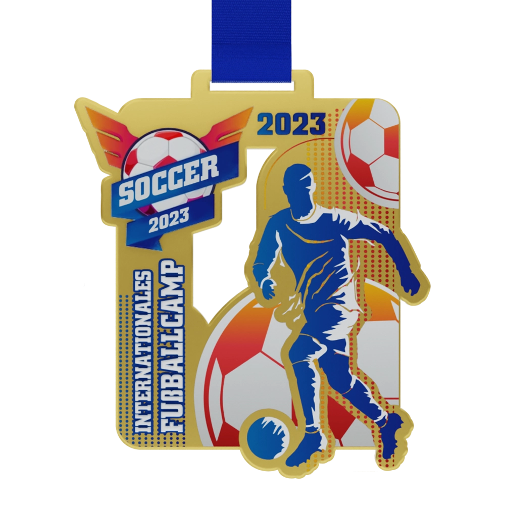 Para muchos, el fútbol es más que un juego. Es una forma de vida y una fuente de emociones increíbles. Comprender este deporte y las expectativas de sus aficionados es nuestro punto de partida para crear medallas de fútbol que reflejen perfectamente la atmósfera del partido en el campo. Las medallas personalizadas que hemos preparado tienen una forma única de cuadrado irregular con recortes en su interior. Las fabricamos en acero y las cubrimos con una impresión colorida con un motivo futbolístico. En el centro de cada una hay una imagen de un futbolista con un balón, símbolo del juego que une a personas en todo el mundo. En el lado izquierdo de la medalla hay espacio para inscripciones y logotipos, lo que convierte a cada una de estas medallas de acero en un recuerdo deportivo único.