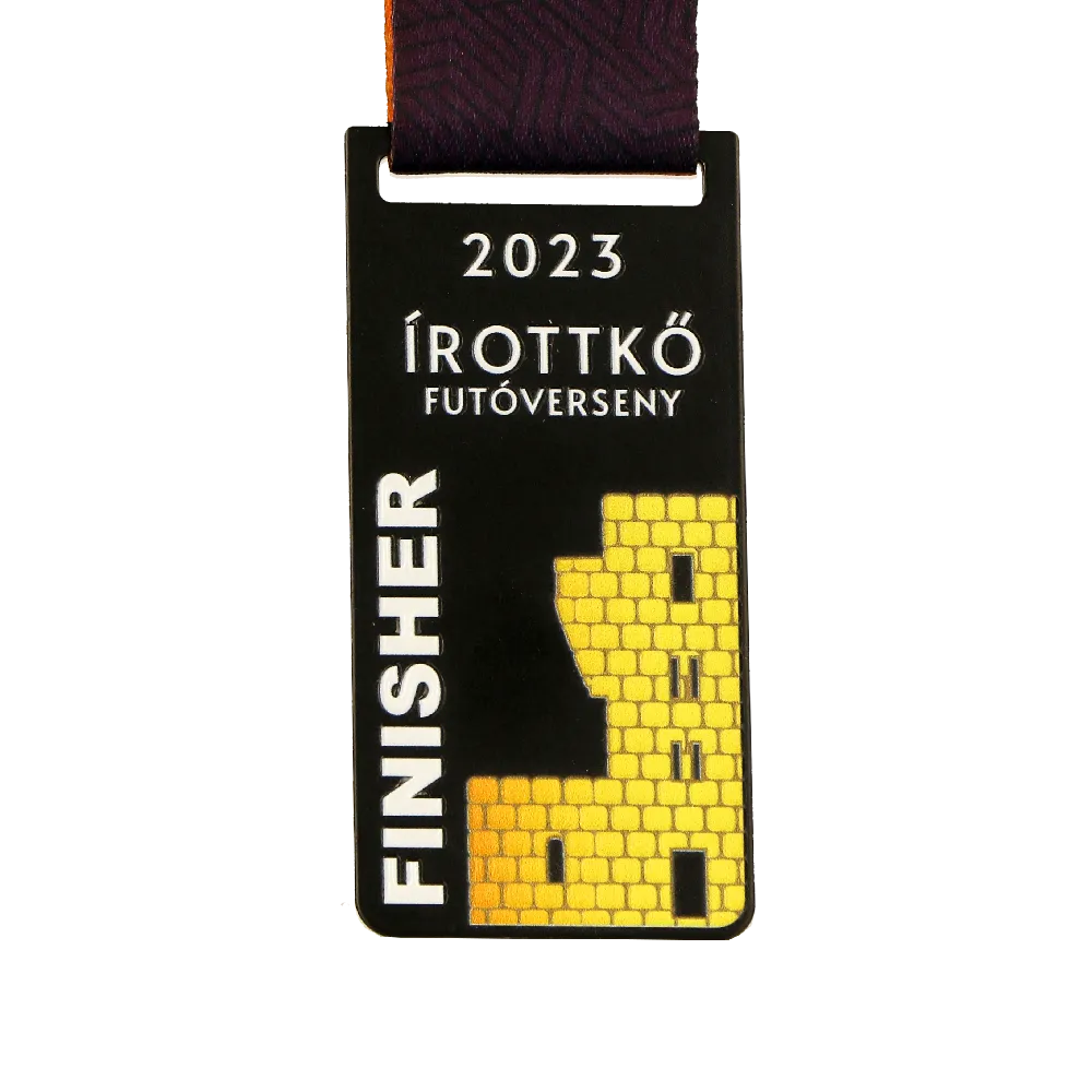 Medallas personalizadas que realizamos para el Irottkö Futóverseny Finisher 2023. Les dimos una forma rectangular y añadimos gráficos con el nombre de la carrera y una torre de castillo amarilla.