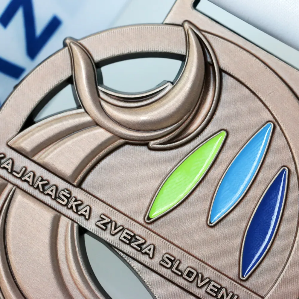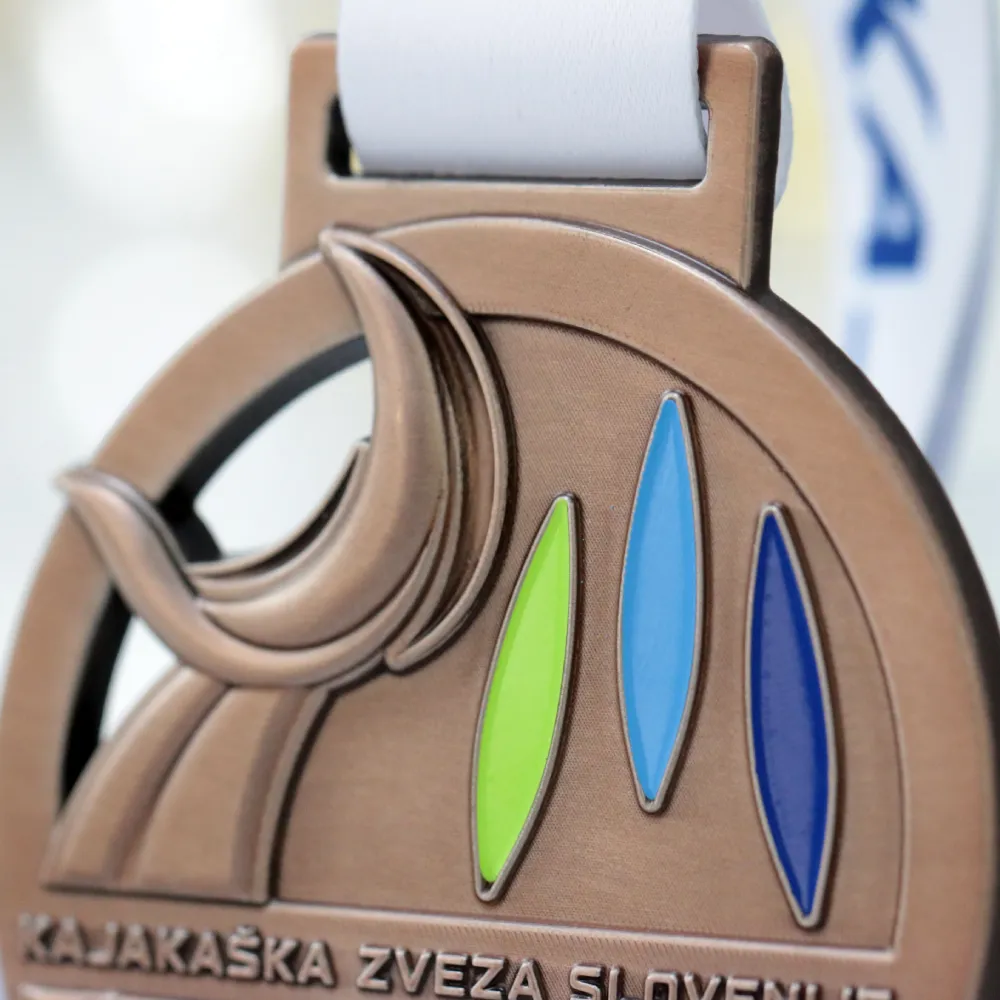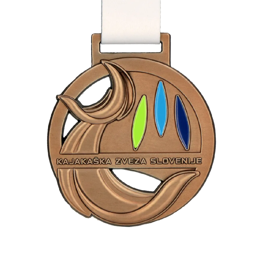 Hemos diseñado una medalla personalizada para una competición organizada por la Kajakaška Zveza Slovenije. Se fabricó con técnica de fundición 3D, con detalles rellenos de esmalte en verde, azul claro y azul marino. La forma circular está rodeada de olas de kayak estilizadas que crean un marco dinámico, y en el centro hay tres palas de kayak colocadas verticalmente una al lado de la otra, que simbolizan distintas disciplinas de este deporte. Podemos preparar una medalla similar para tu evento.