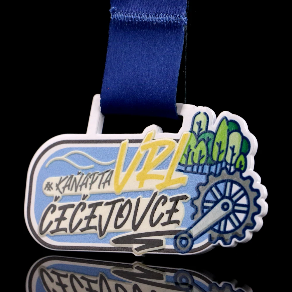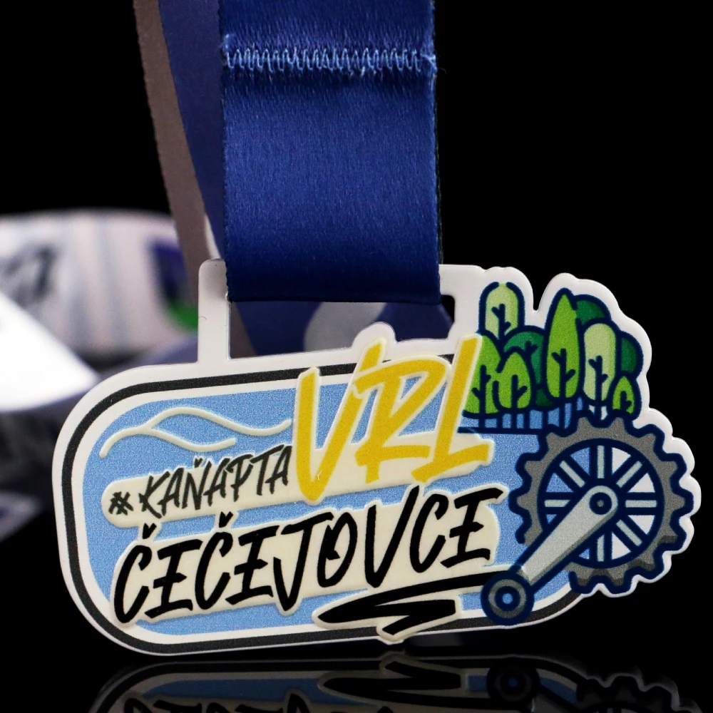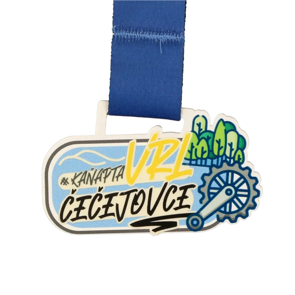 Una medalla bien hecha cumple dos funciones: es un recuerdo que permite al participante rememorar el éxito durante mucho tiempo y es una hermosa pieza representativa de todo el evento. Sin embargo, para lograr este doble efecto se necesitan tanto experiencia como un enfoque individual. Con Winmed, obtienes todo esto y mucho más. Un ejemplo de ello es la medalla personalizada que preparamos para el Kanapta URL Cecejovce. Su forma fue creada mediante un preciso corte por láser, lo que permitió obtener un acabado perfecto hasta en el más mínimo detalle. Además, aplicamos una impresión UV a color sobre la superficie blanca de la medalla. Sus colores vivos destacan y atraen todas las miradas. El conjunto se completa con una cinta de catálogo perfectamente adaptada al diseño.