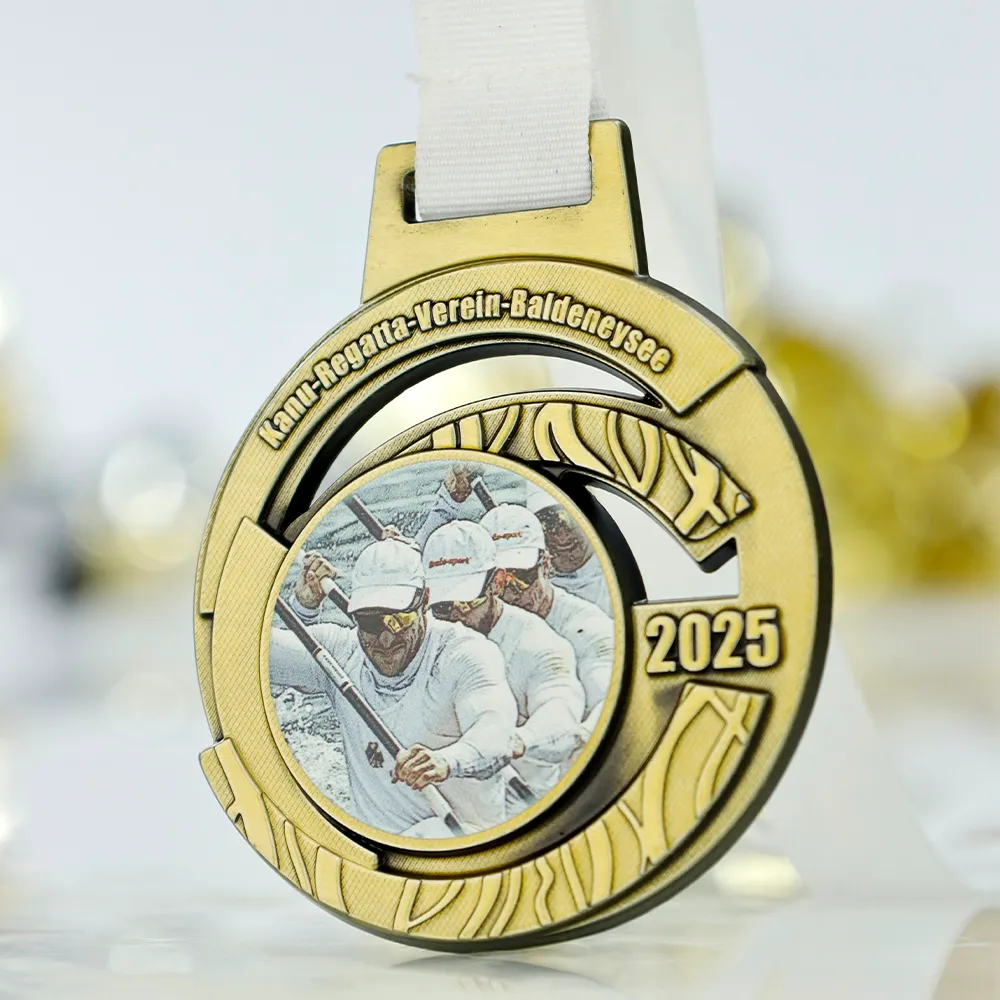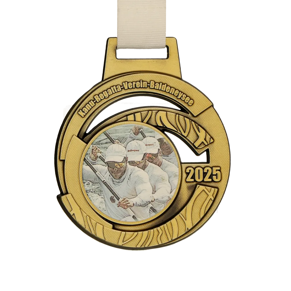 Esta medalla personalizada se diseñó para el Kanu-Regatta-Verein Baldeneysee en 2025. Es una medalla fundida con impresión UV, fabricada para una competición profesional de piragüismo. La pieza está fundida con acabado dorado y presenta detalles geométricos calados. En el centro, el gráfico impreso en UV muestra de forma dinámica a un equipo de cuatro remeros en una embarcación.
