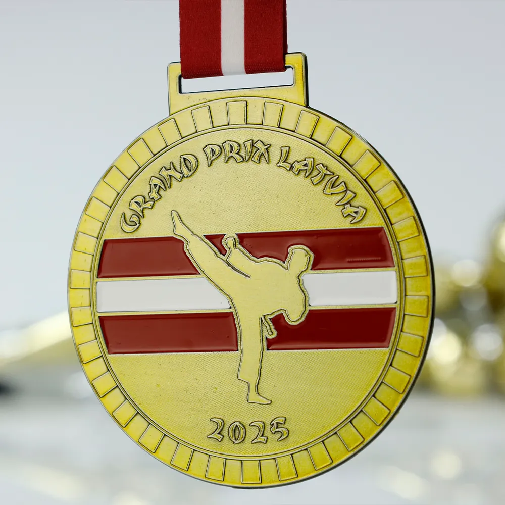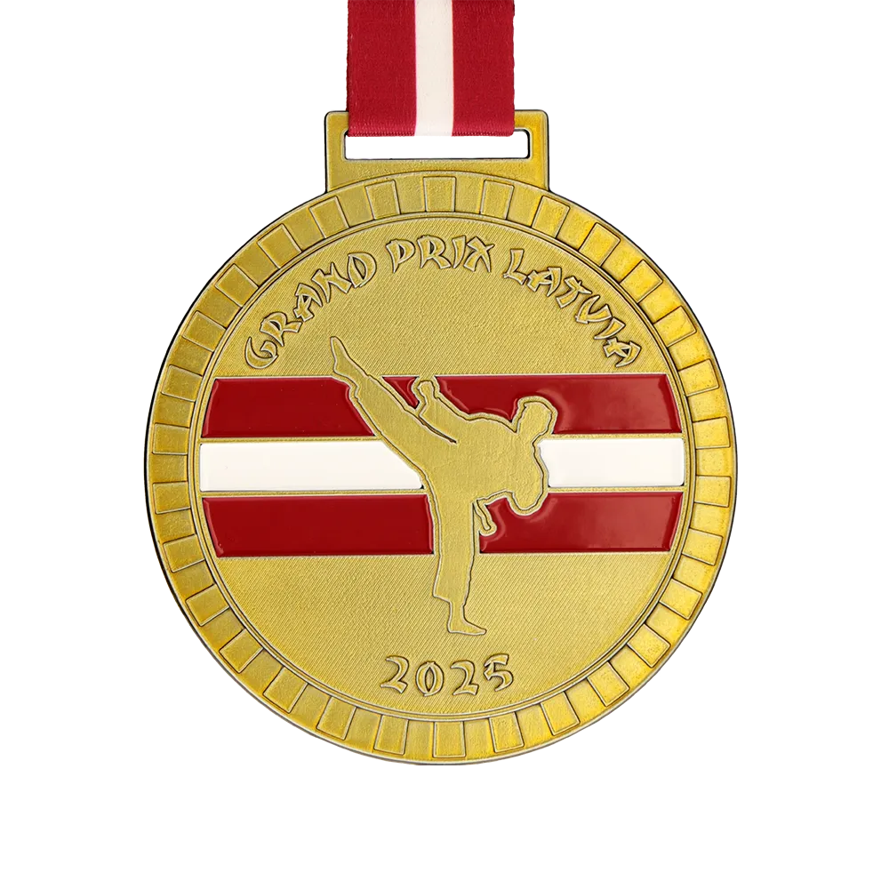Medalla fundida en técnica 2D con esmalte de color. El motivo presenta la silueta de un competidor dando una patada sobre el fondo de la bandera de Letonia con franjas rojas y blancas en el disco. El nombre del evento es Grand Prix Latvia y el año 2025. Destinada a competiciones de artes marciales y torneos deportivos. La personalización incluye textos, logotipos y gráficos.