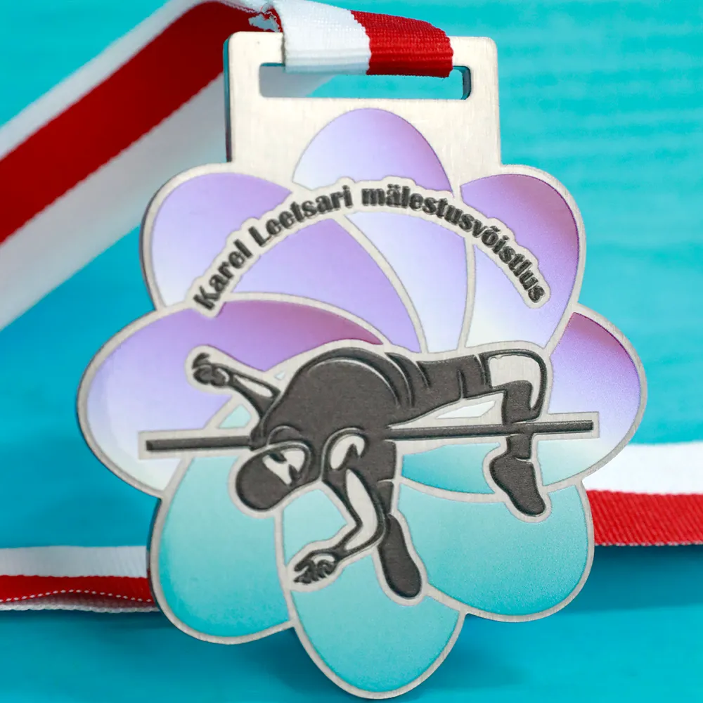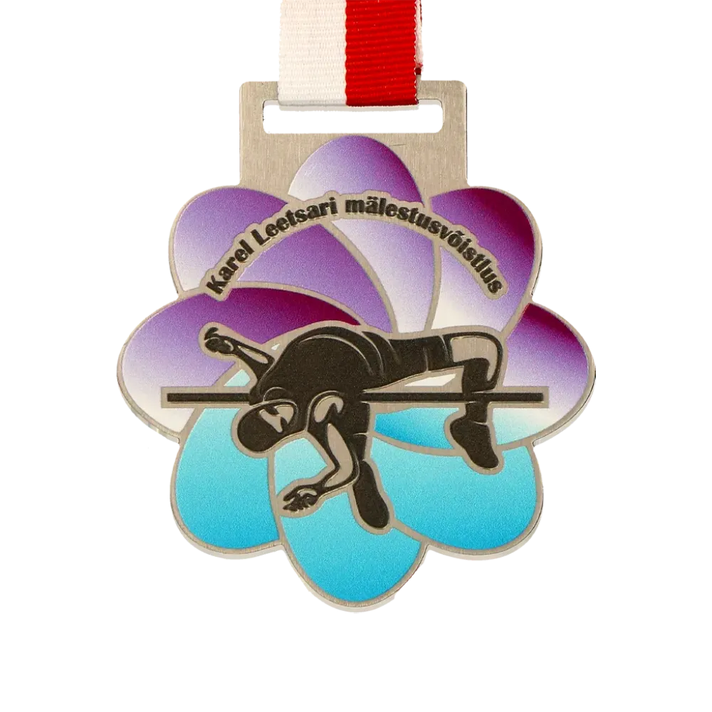 Una medalla personalizada para el Karel Leetsari mälestusvõistlus. Una medalla en forma de flor con la silueta impresa de un atleta en pleno salto, que refleja el dinamismo y la pasión por el deporte.
