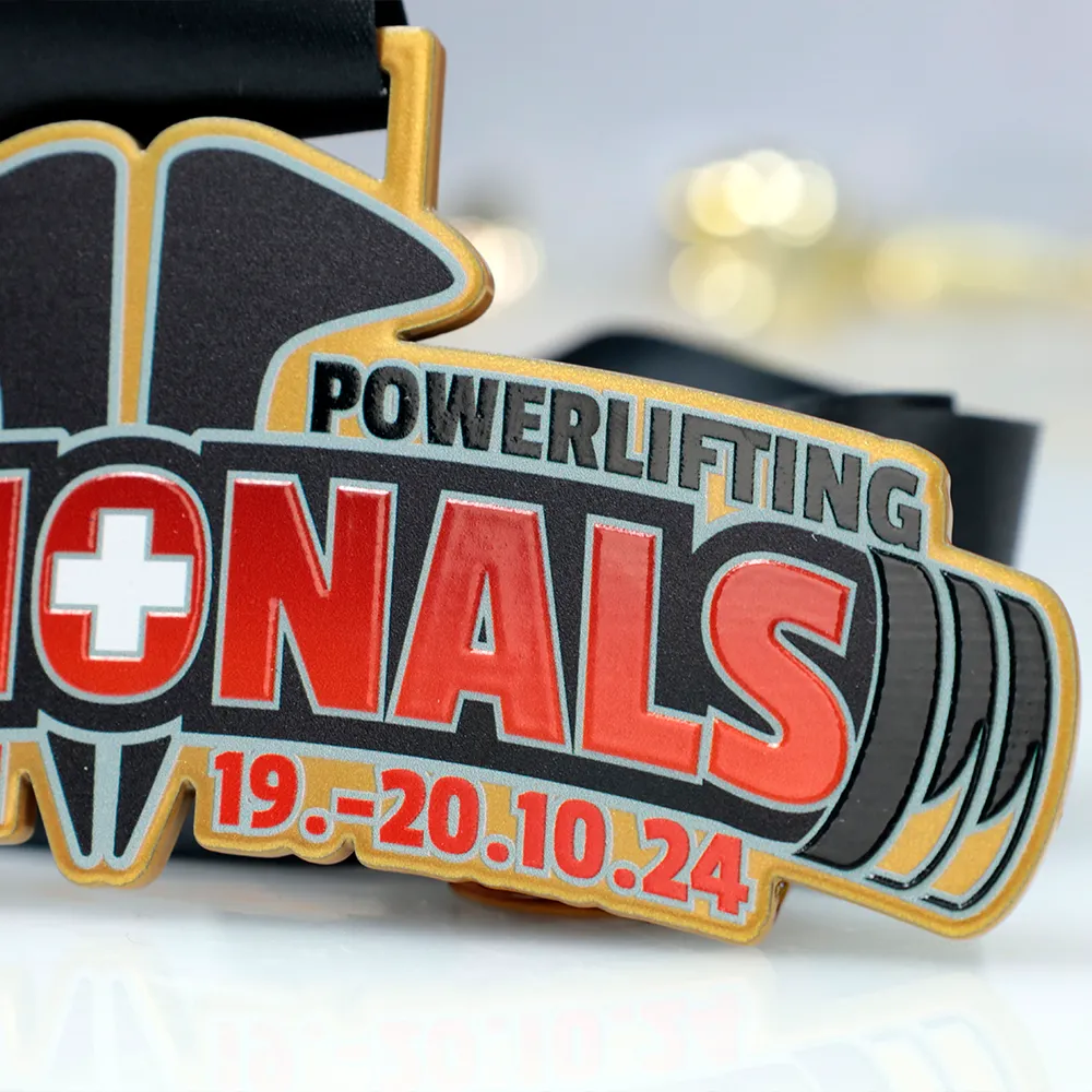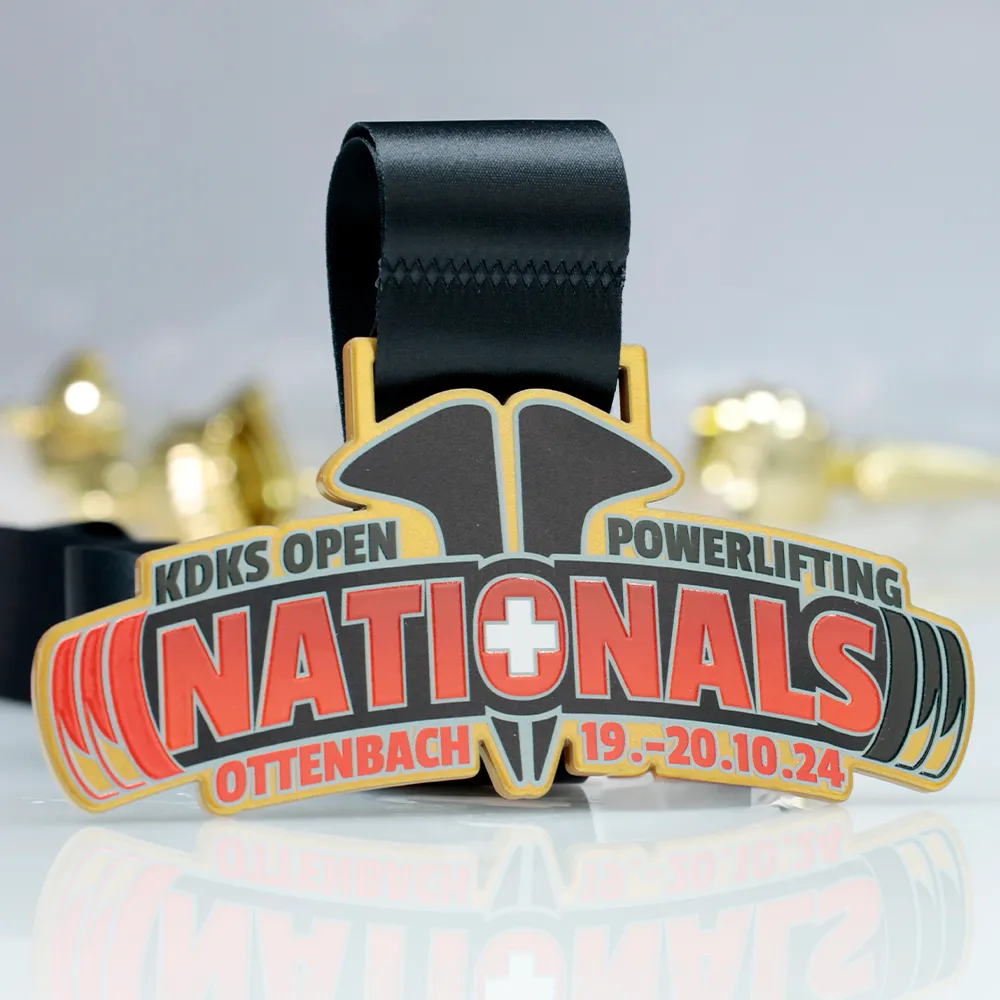 Una medalla personalizada creada para el KDKS Open Powerlifting Nationals en Ottenbach. La medalla presenta un diseño dinámico con la palabra central 'Nationals' en rojo, destacada por un símbolo de la cruz suiza. A ambos lados, gráficos de barras y pesas reflejan la disciplina de la competición. La medalla está suspendida en una cinta negra, lo que añade un toque elegante.