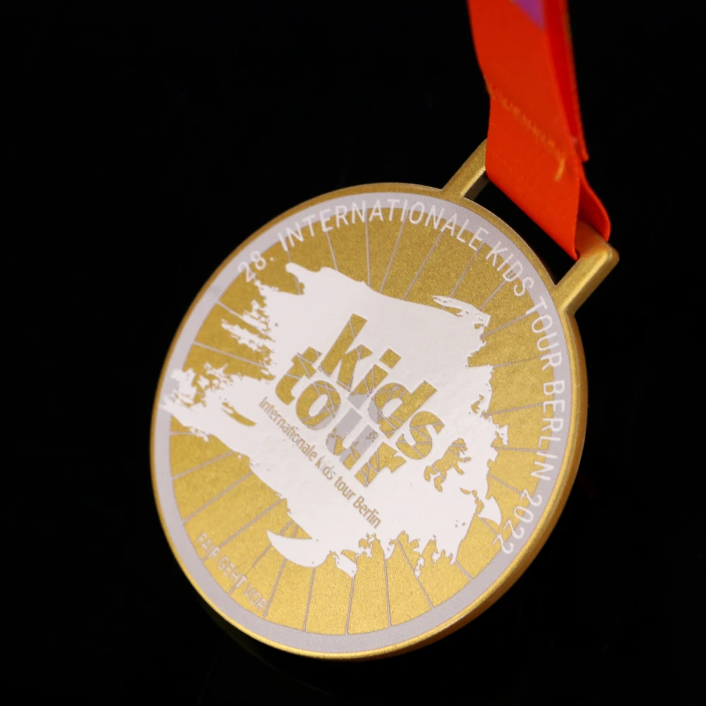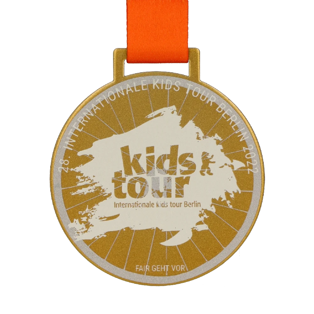 Un diseño clásico también puede cautivar la imaginación. El organizador de la Kids Tour Berlin lo sabe muy bien, ya que diseñamos para ellos una original medalla de acero con forma redonda clásica. Su color dorado se complementa con una impresión en colores vivos. Además, sus tonos claros combinan perfectamente con el diseño general y el barniz aplicado les da un brillo espectacular bajo la luz. La medalla personalizada destaca por sus numerosas decoraciones simétricas en forma de líneas impresas. Estas se encuentran en el centro, proporcionando un fondo perfecto para el nombre impreso del evento ciclista durante el cual se otorgó la medalla.
