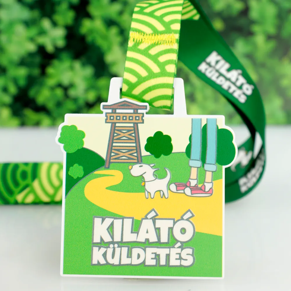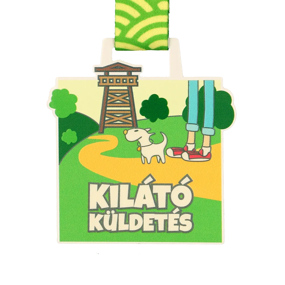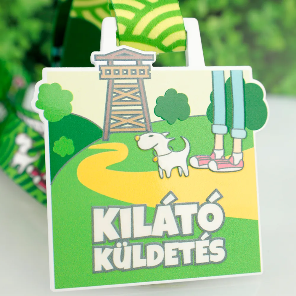 Una medalla personalizada para los participantes del evento Kilátó Küldetés es un recuerdo colorido que refleja perfectamente el espíritu del evento. La forma de la medalla se logró mediante un corte láser preciso, lo que le da un aspecto personalizado e interesante. Los gráficos e inscripciones en color se aplicaron cuidadosamente mediante impresión UV.