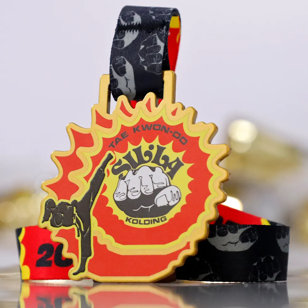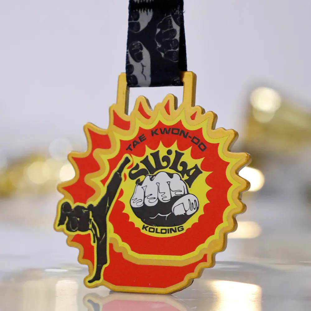 Una medalla personalizada diseñada para el torneo de Taekwondo en Kolding. Presenta un motivo dinámico de una patada y un puño cerrado sobre llamas rojas y amarillas realizadas con impresión UV. La medalla está personalizada con el nombre del club y de la ciudad. Se acompaña de una cinta negra con un motivo de puño impreso.
