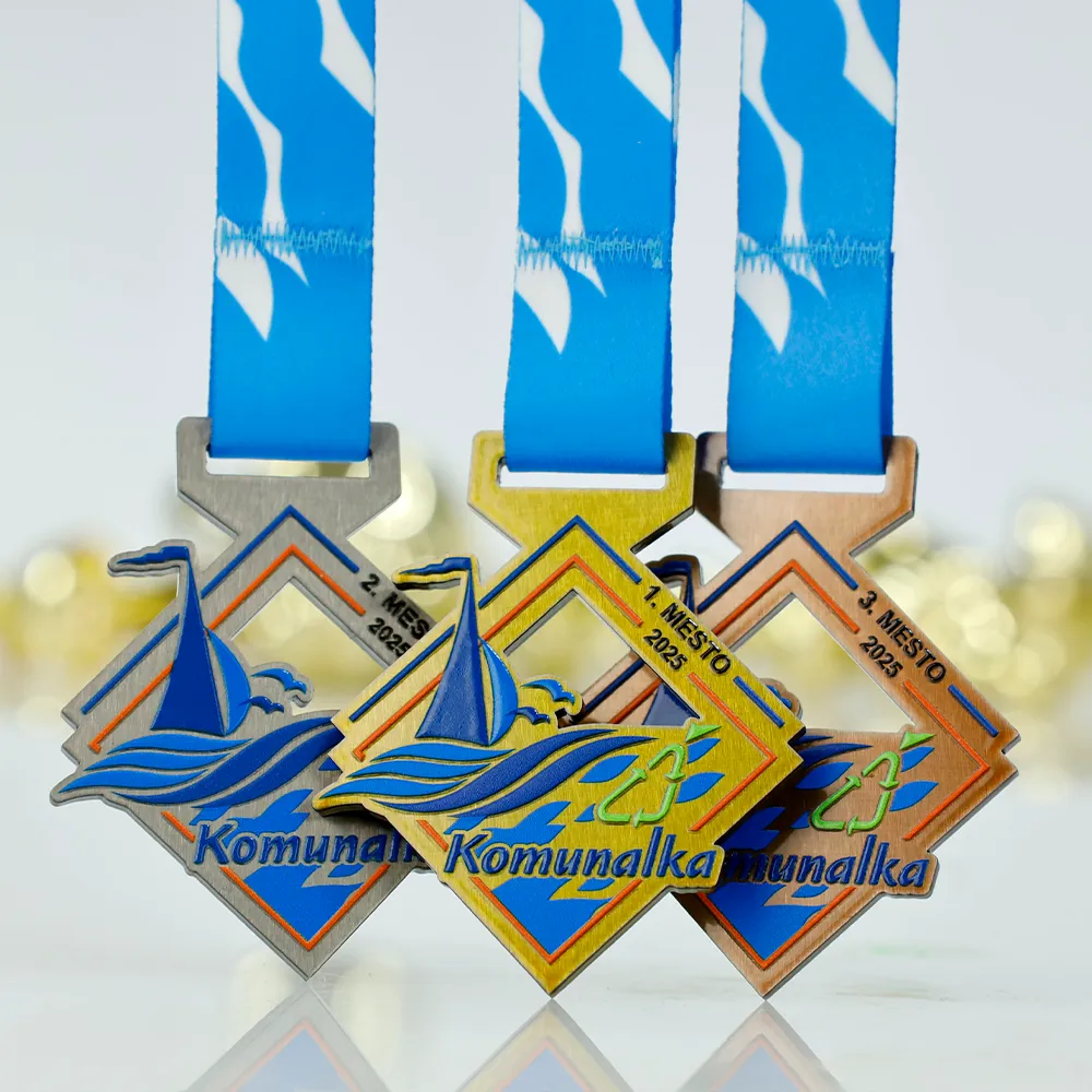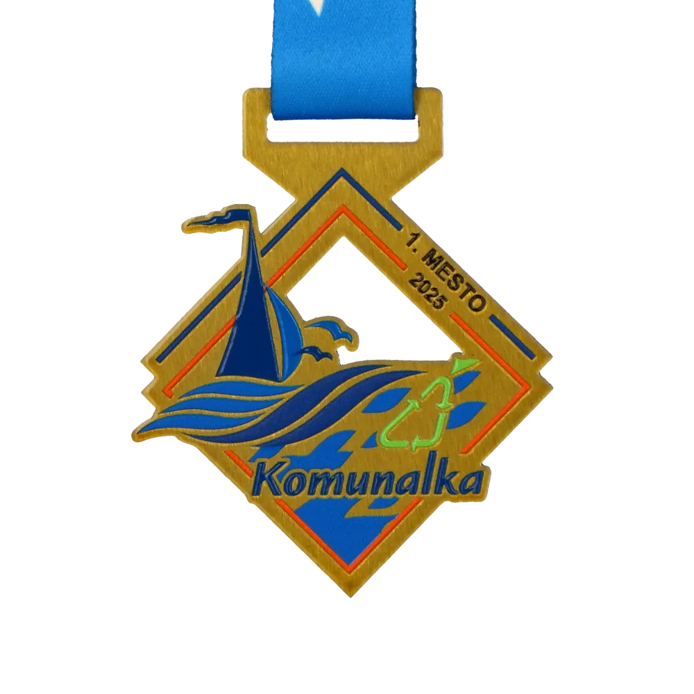Medalla personalizada de metal, cortada con láser. Diseñada para la regata Komunalka 2025. La medalla muestra un yate, olas y una gaviota, mientras que los detalles de color se aplican con impresión UV duradera. La personalización incluye el nombre del evento, la edición y el año.