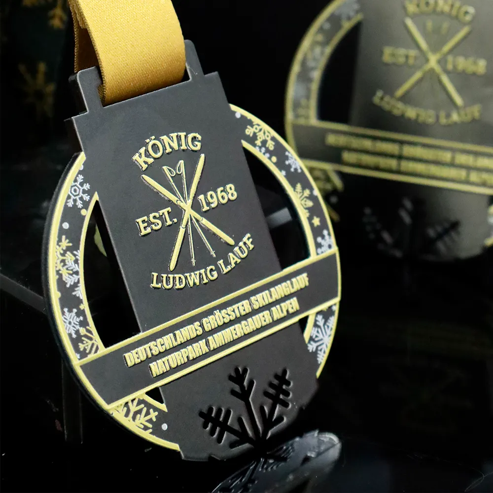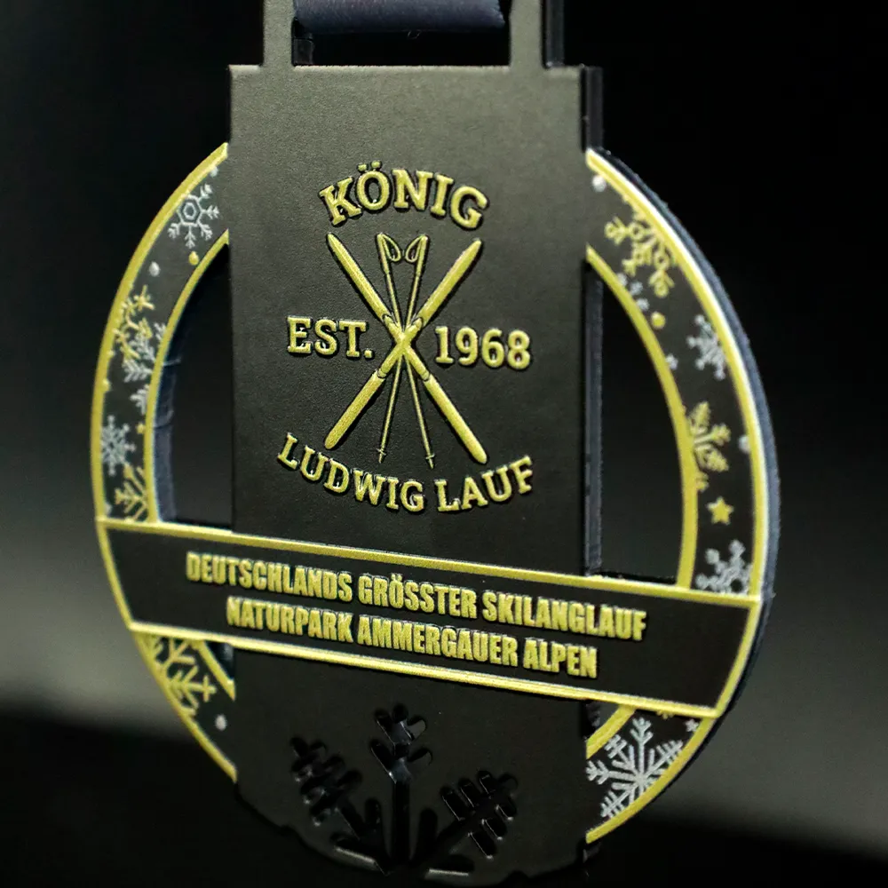 Una medalla personalizada de deportes de invierno fabricada para el König Ludwig Lauf. Un diseño redondo con recortes en el centro, que presenta un motivo invernal impreso.