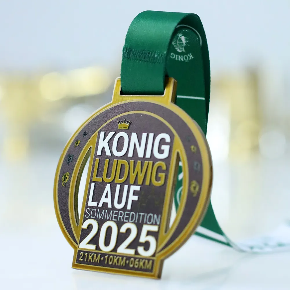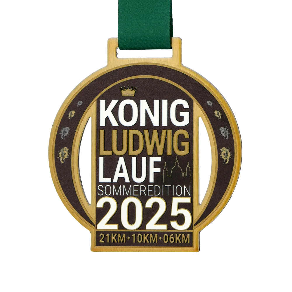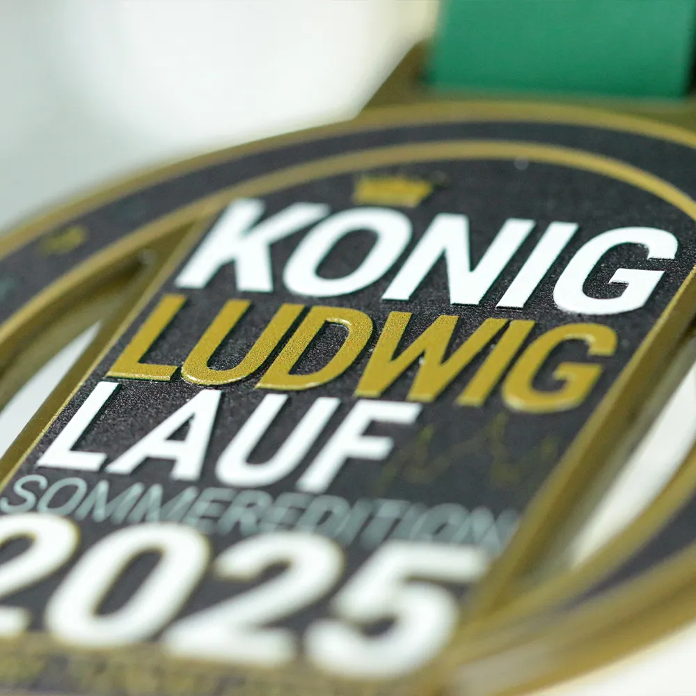 La medalla de acero de la König Ludwig Lauf Sommeredition 2025 destaca por su forma original y la elegante combinación de dorado, bronce y blanco. La técnica de impresión UV garantiza una excelente legibilidad de todos los elementos de personalización y confiere un acabado profesional al motivo gráfico con la corona. Este tipo de medallas deportivas ofrece una solución elegante y moderna para los organizadores que desean entregar a los participantes un recuerdo de gran calidad estética.