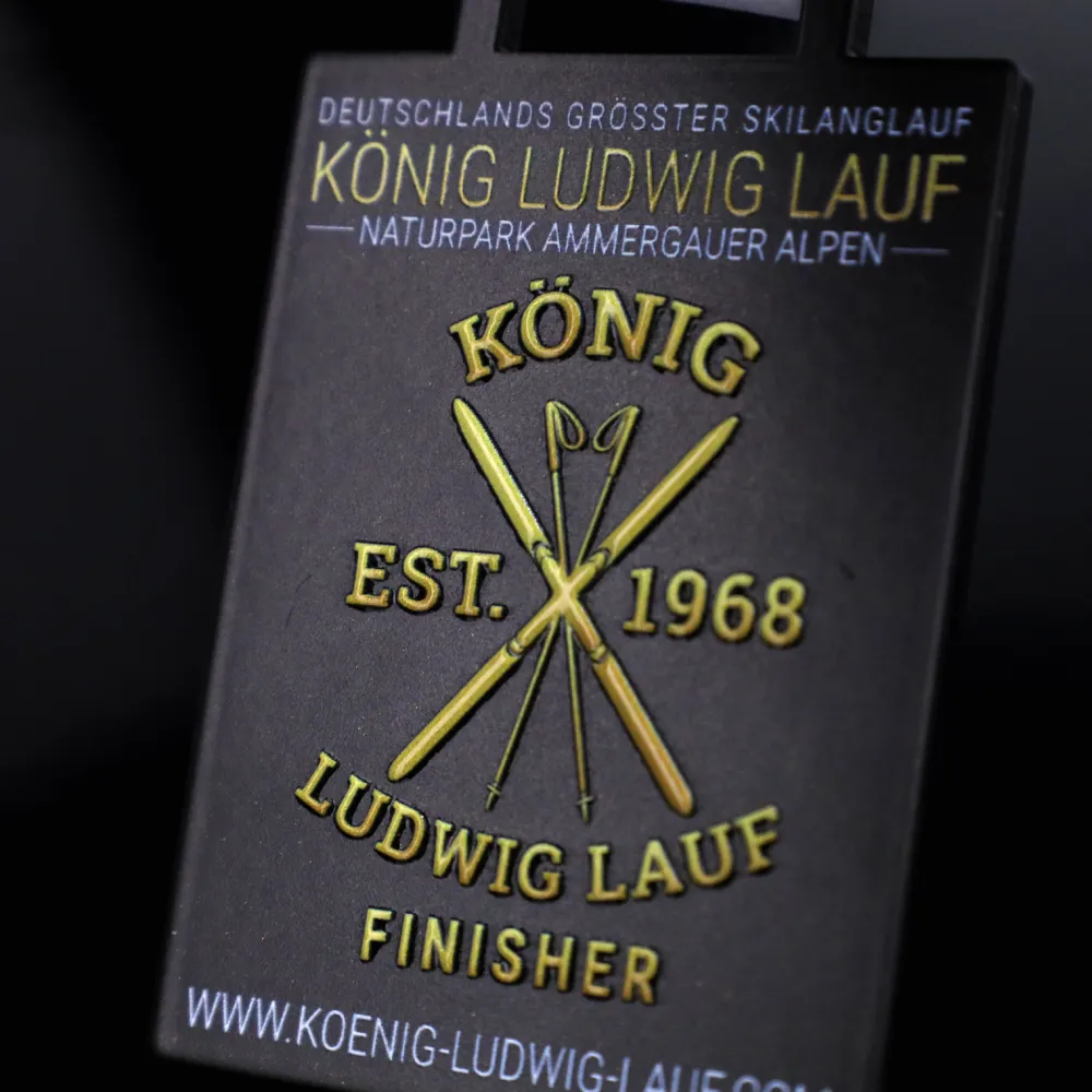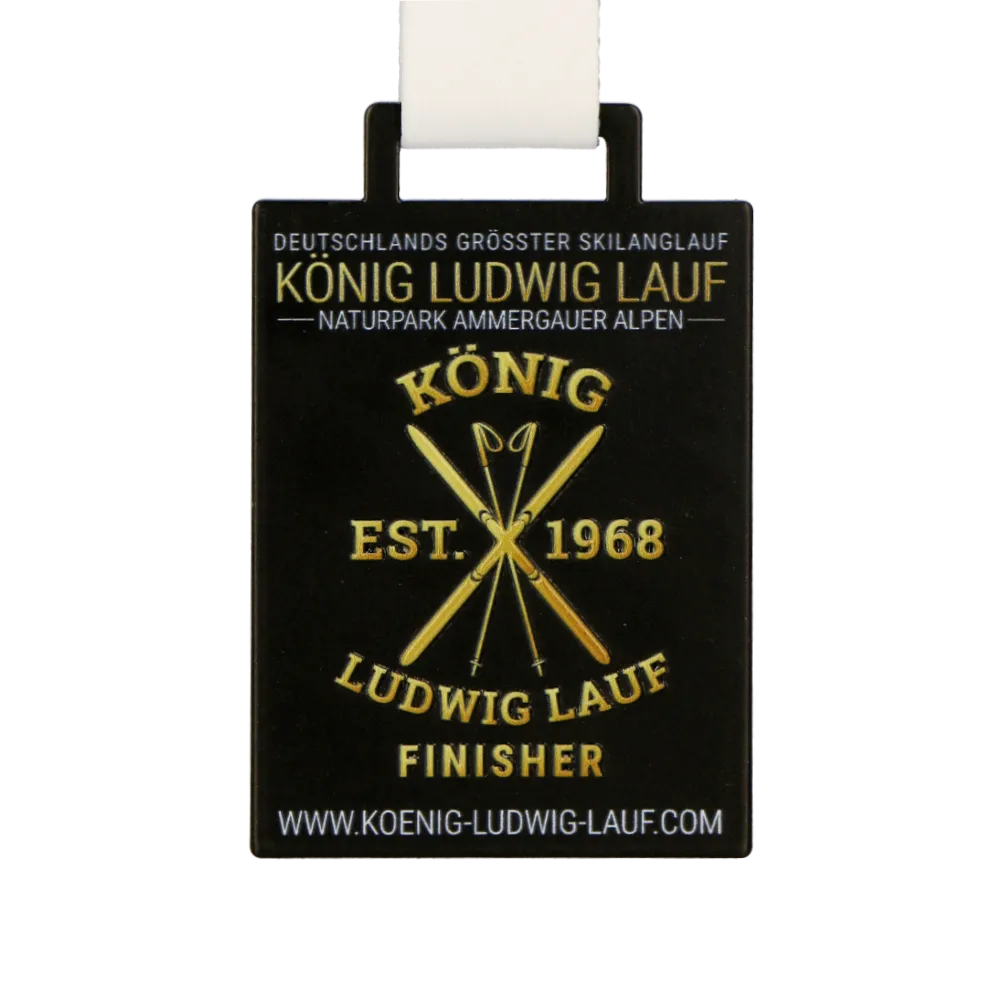 La actividad deportiva también es posible en invierno. Los deportes de invierno cuentan con muchos aficionados que participan en diversas competiciones y carreras. Uno de estos eventos es el König Ludwig Lauf. Su carácter invernal se percibe no solo en el ambiente, sino también en las medallas preparadas para los competidores. Recibieron medallas personalizadas únicas con un diseño elegante. Tienen una forma rectangular clásica y un color negro, que es el fondo perfecto para una impresión personalizada. En la superficie de la medalla también hay decoraciones realizadas con precisión con un motivo invernal. Su textura se puede sentir al tacto. El conjunto se completa con una cinta de sublimación estilísticamente a juego.