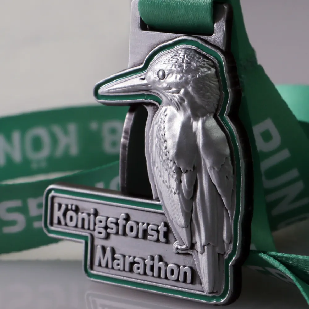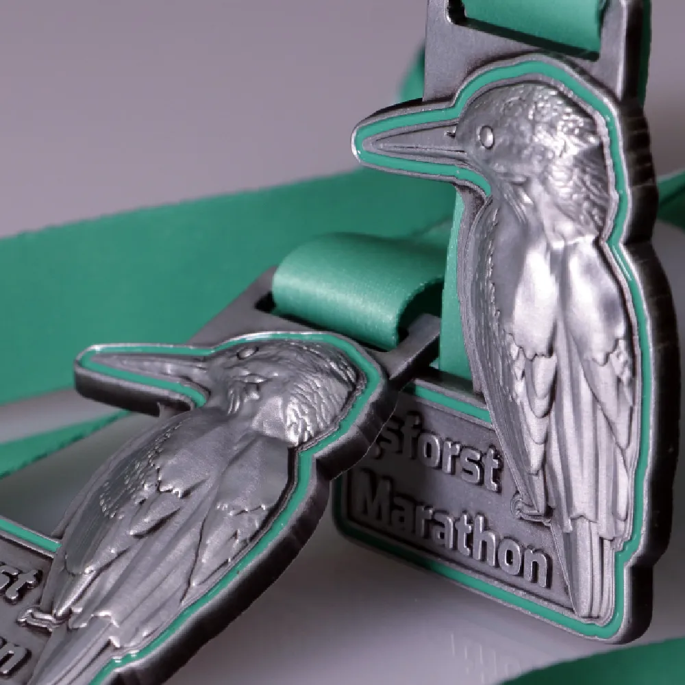 Los corredores pueden elegir entre numerosos eventos deportivos en los que competir por el título de mejor atleta. Hay carreras con multitudes de participantes que se han preparado durante todo el año para estar en la línea de salida. Estos eventos atraen a los atletas por su recorrido, ambiente y premios. Así ocurrió también con el Maratón de Königsforst, que fue coronado con nuestras medallas personalizadas. Las medallas para carrera se distinguieron por una forma inusual y una decoración única en forma de bajorrelieve con un ave. Sus detalles perfectamente reproducidos y su ejecución precisa hicieron que la decoración pareciera muy realista. Además, las medallas son de color plateado, con esmalte y una inscripción tridimensional con el nombre del evento en su superficie. Todo el conjunto se remata con una cinta de sublimación en un color a juego.