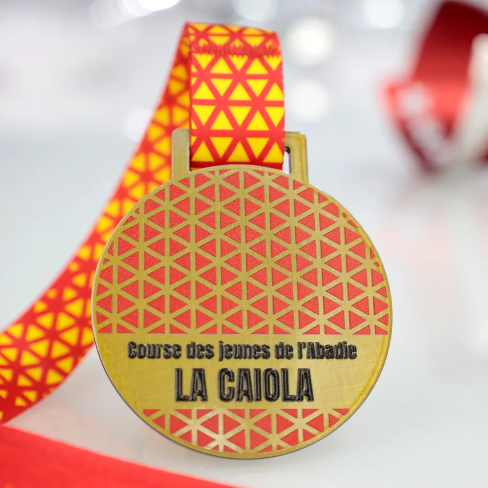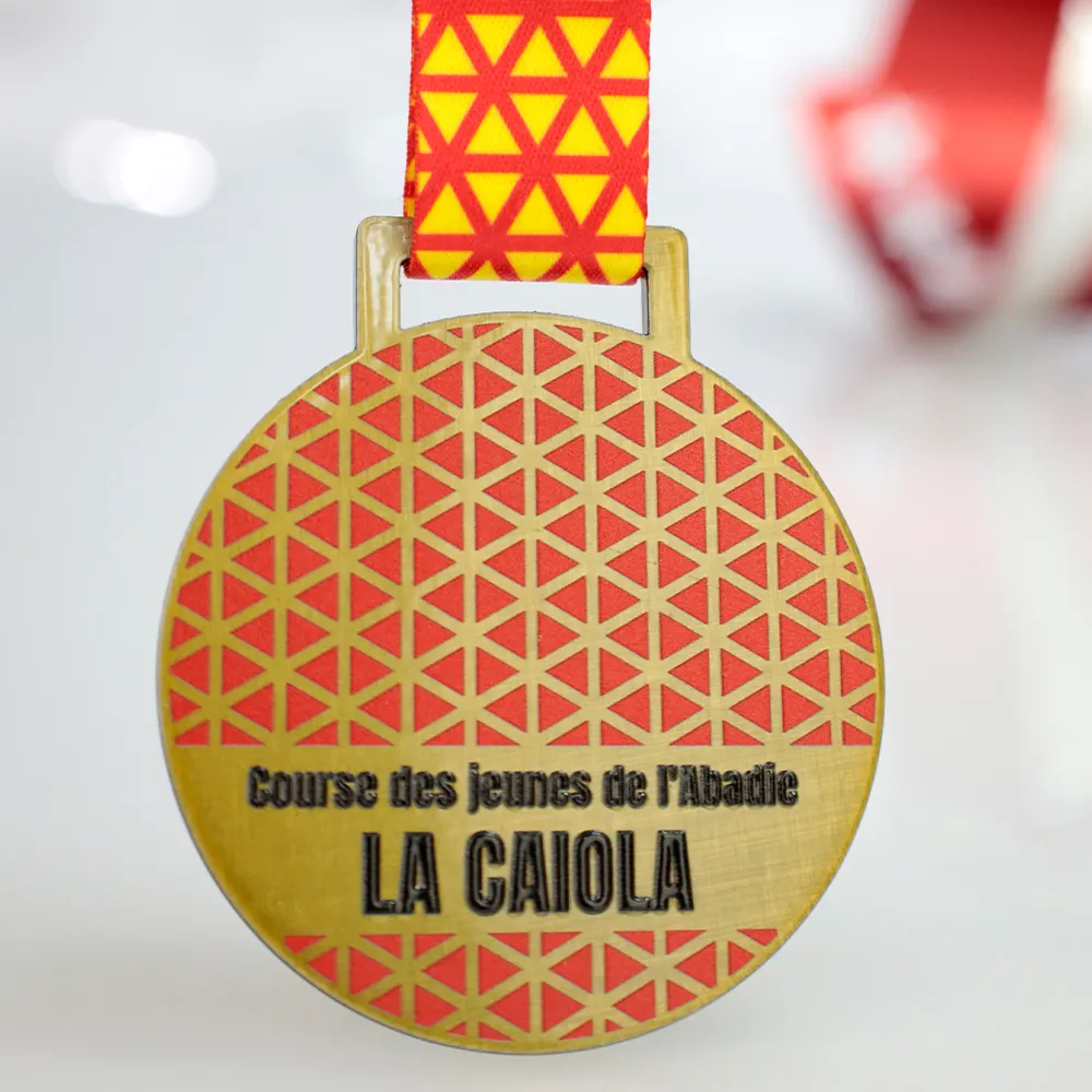 La medalla personalizada para La Caiola se distingue por su elegante diseño, con adornos rojos intensos realizados con impresión UV. Estos detalles aportan colores vibrantes, duraderos y resistentes al desgaste. Es un recuerdo perfecto para los participantes de esta carrera.