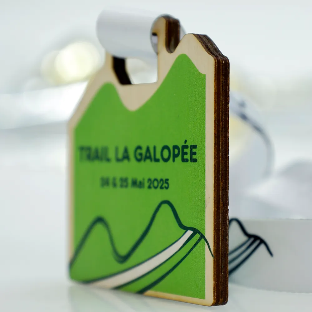 Unas medallas personalizadas creadas para el evento Trail La Galopée 2025. Fabricadas en acero, cortadas con precisión mediante láser y decoradas con impresión UV a color. El diseño en verde con un motivo de montaña refleja la ruta del trail y su carácter natural. La medalla cuelga de una cinta blanca que combina con el estilo general. Una elección perfecta para organizadores de trails y carreras de montaña.