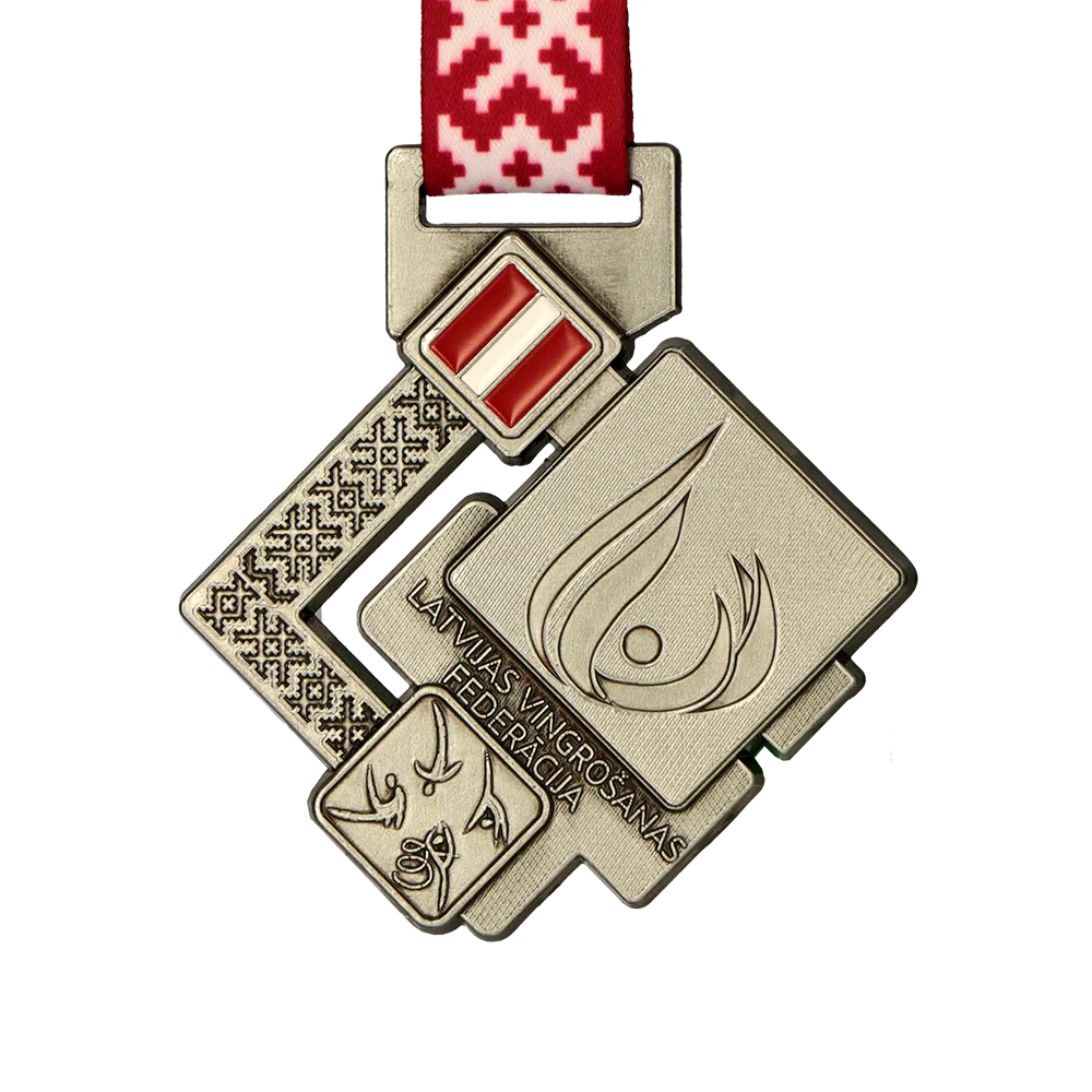 Medalla fundida 2D con esmalte en rojo y blanco. El diseño incluye el logotipo de la federación de gimnasia y motivos nacionales. La medalla está personalizada con el nombre de la institución y gráficos relacionados con la gimnasia.