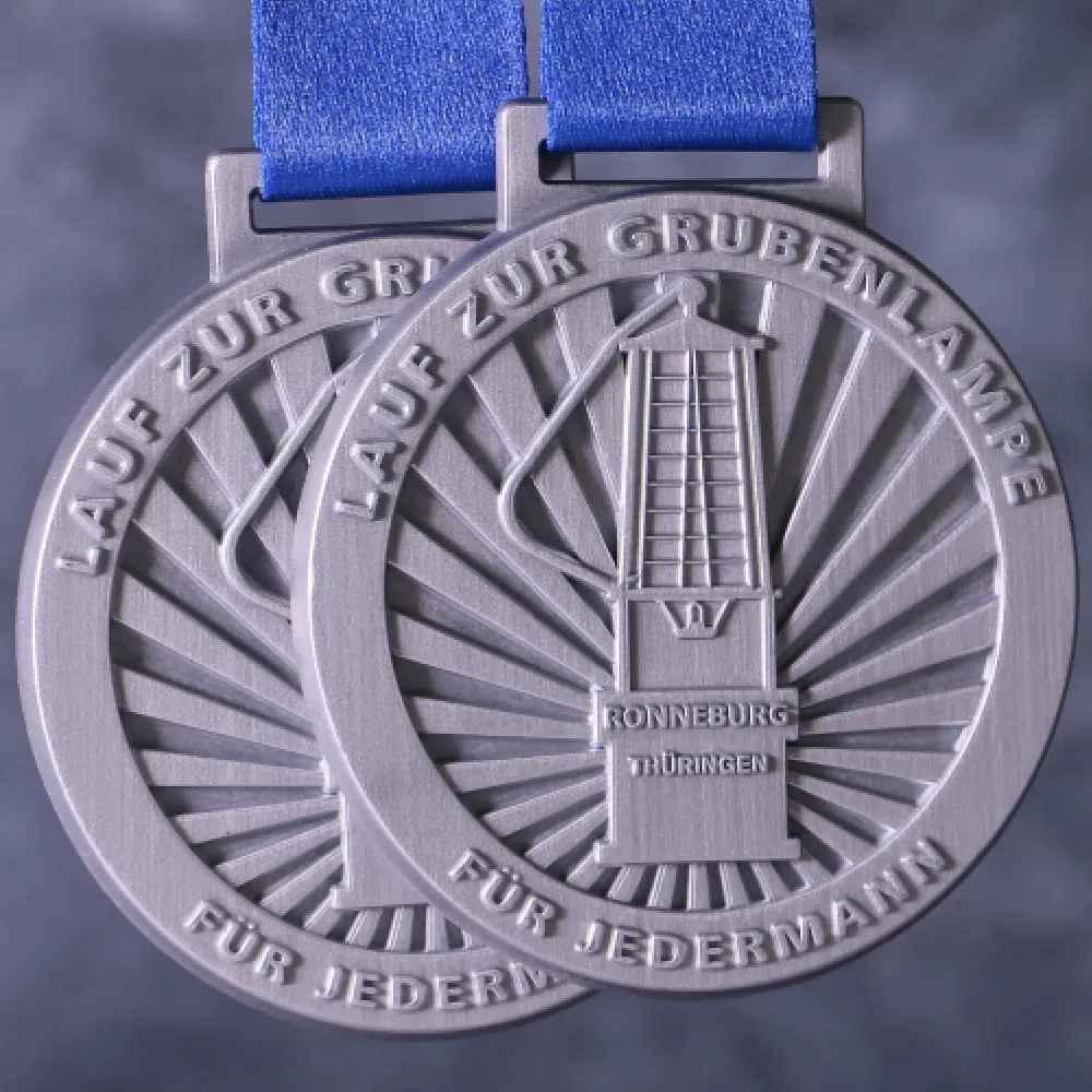 ¿Te preguntas qué hará que los participantes recuerden durante más tiempo el evento que organizas? Adaptar la medalla a la atmósfera del evento sin duda ayudará. Las medallas para carrera no solo son símbolos de victoria, sino también grandes recuerdos que forman parte importante de la colección de un corredor. Por eso, para el Lauf zur Grubenlampe preparamos sólidas medallas personalizadas con una forma clásica y redonda. Están llenas de decoraciones tridimensionales perfectamente adaptadas al tema del evento. La medalla tiene un elegante color plateado y está rematada con una cinta personalizada que complementa a la perfección todo el diseño.