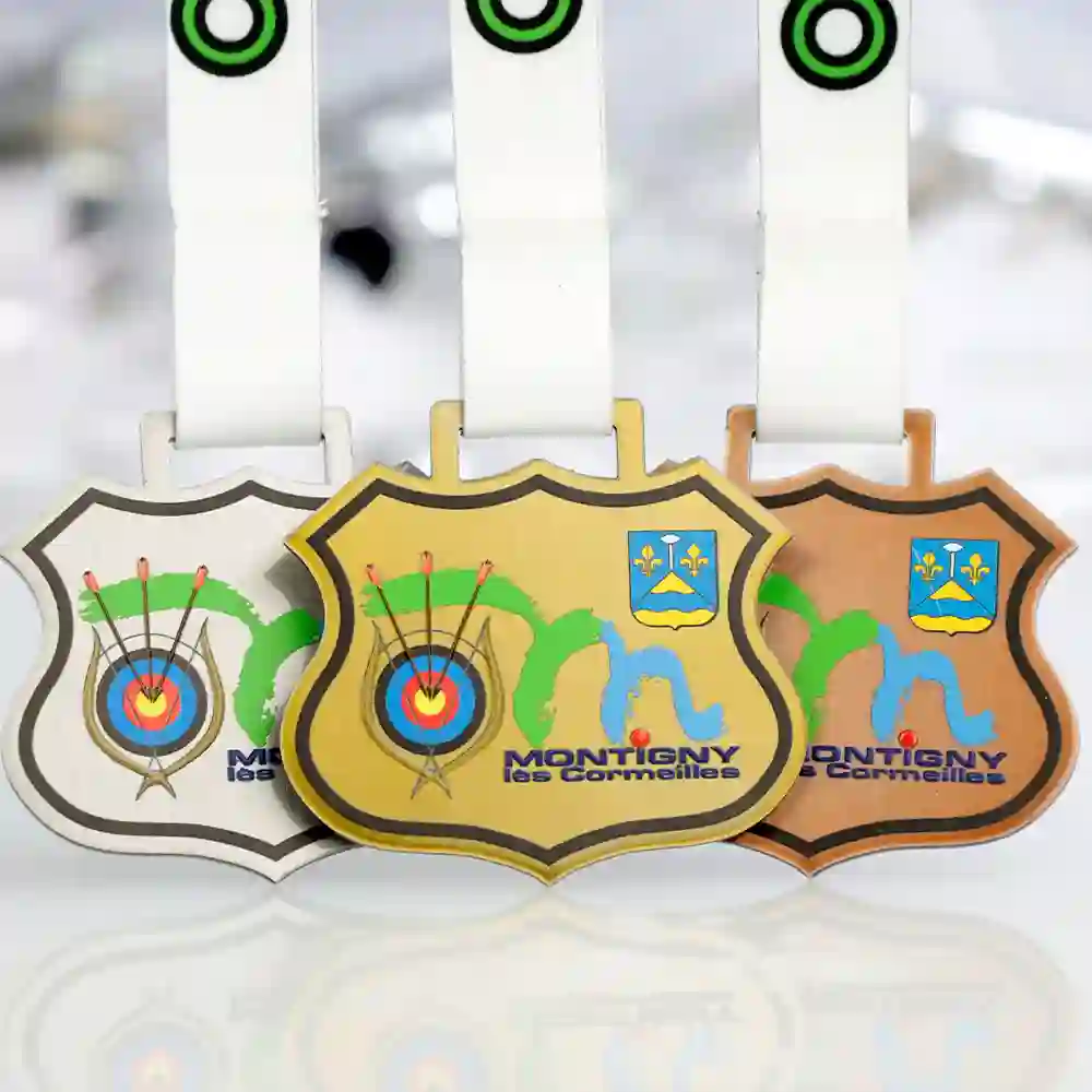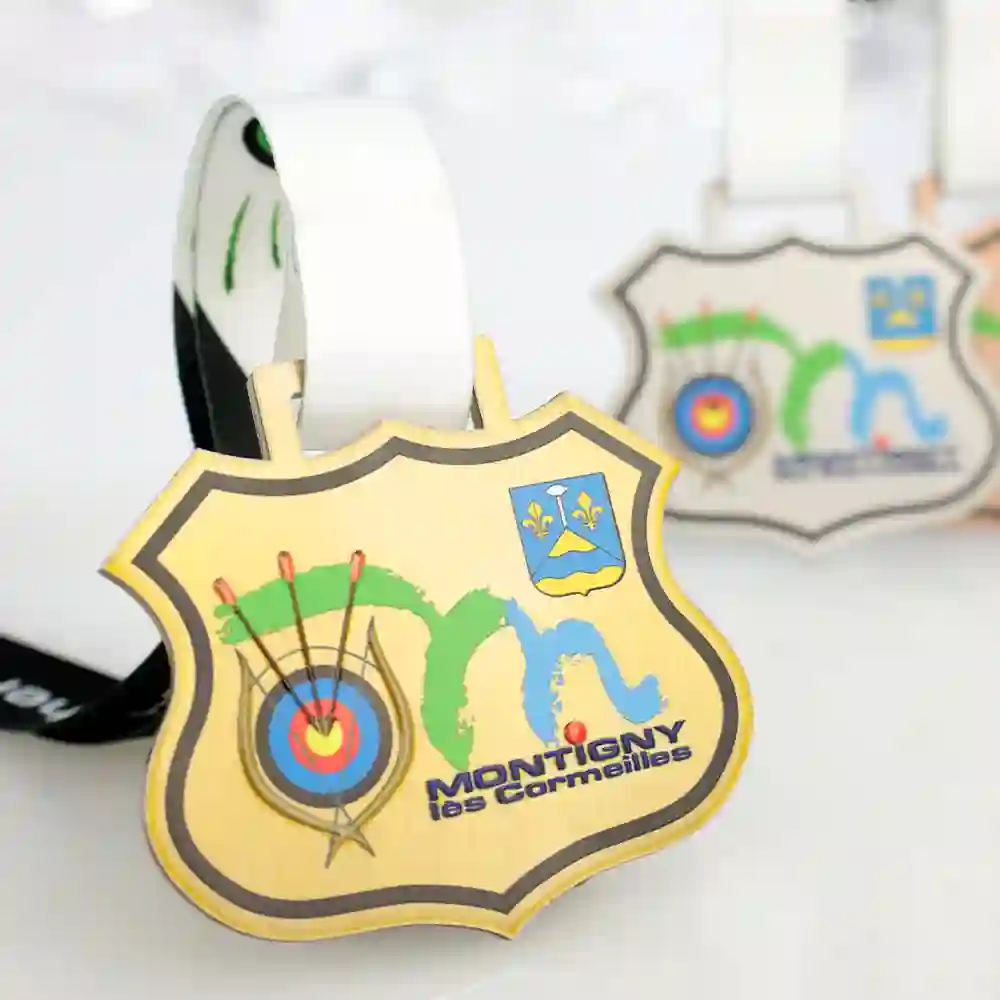 Un medalla personalizada creado para la competición de tiro con arco en Montigny-lès-Cormeilles destaca por su forma única, cortada con láser de manera precisa. Los gráficos de la medalla se aplicaron mediante impresión UV, garantizando colores vivos y una gran durabilidad.