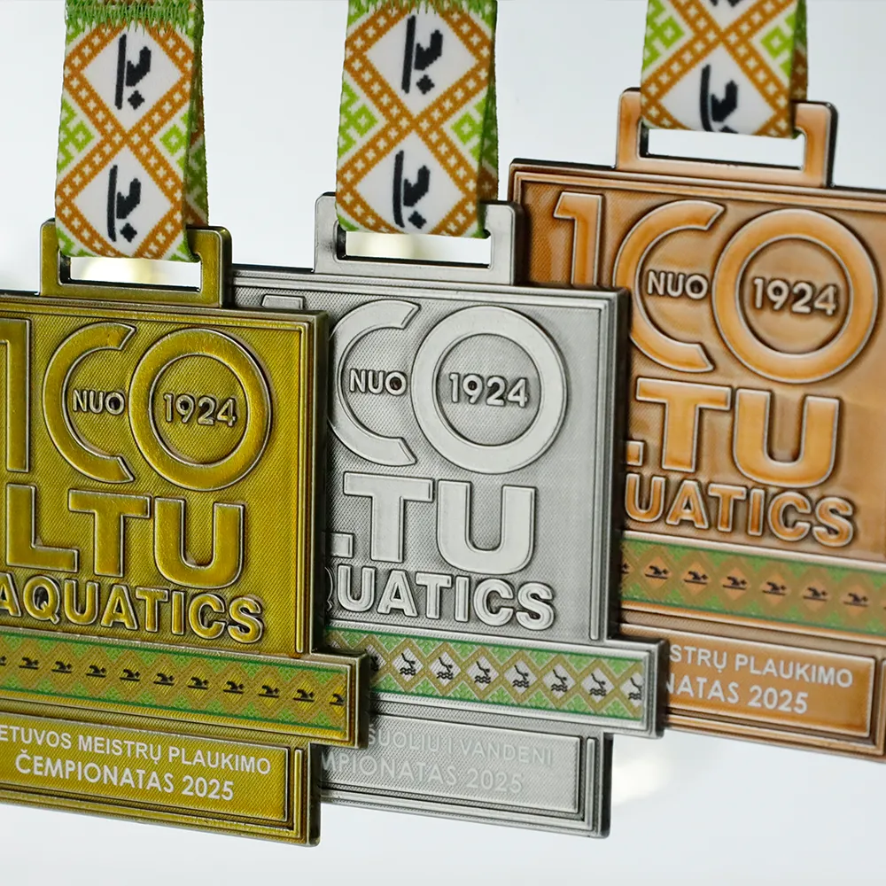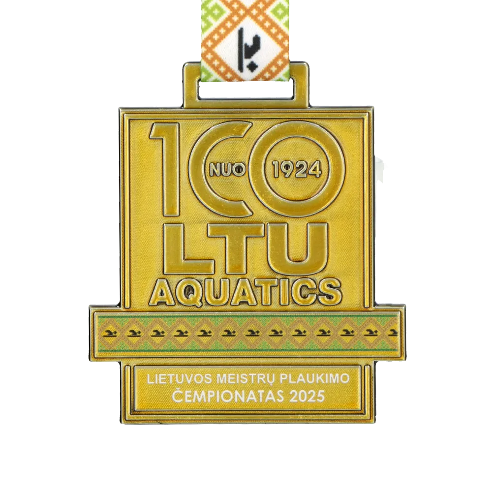 Medalla fundida impresa preparada para el Campeonato de Natación de Lituania 2025. La medalla fue fundida y acabada en color dorado. Los textos y decoraciones se realizaron con impresión UV en tonos verdes y negros. Esta medalla personalizada puede servir de inspiración para organizadores de competiciones de natación.