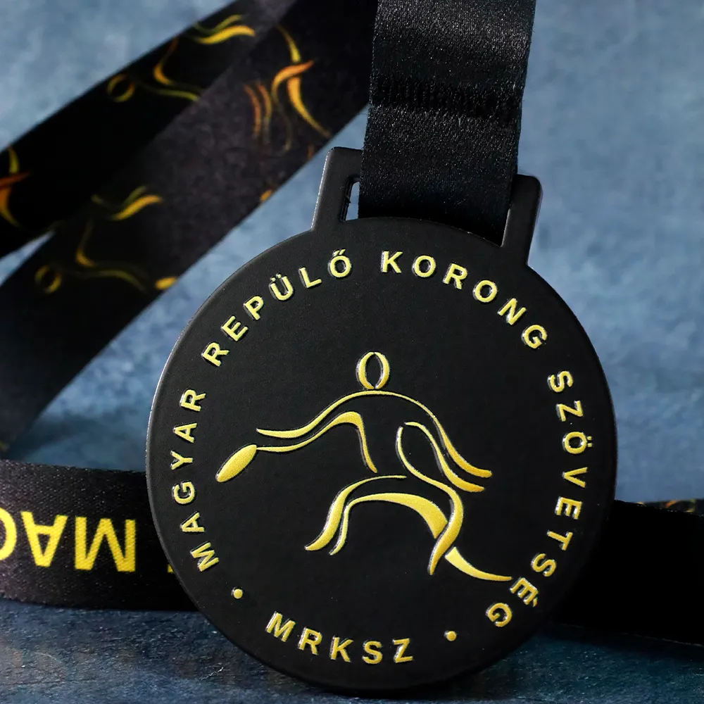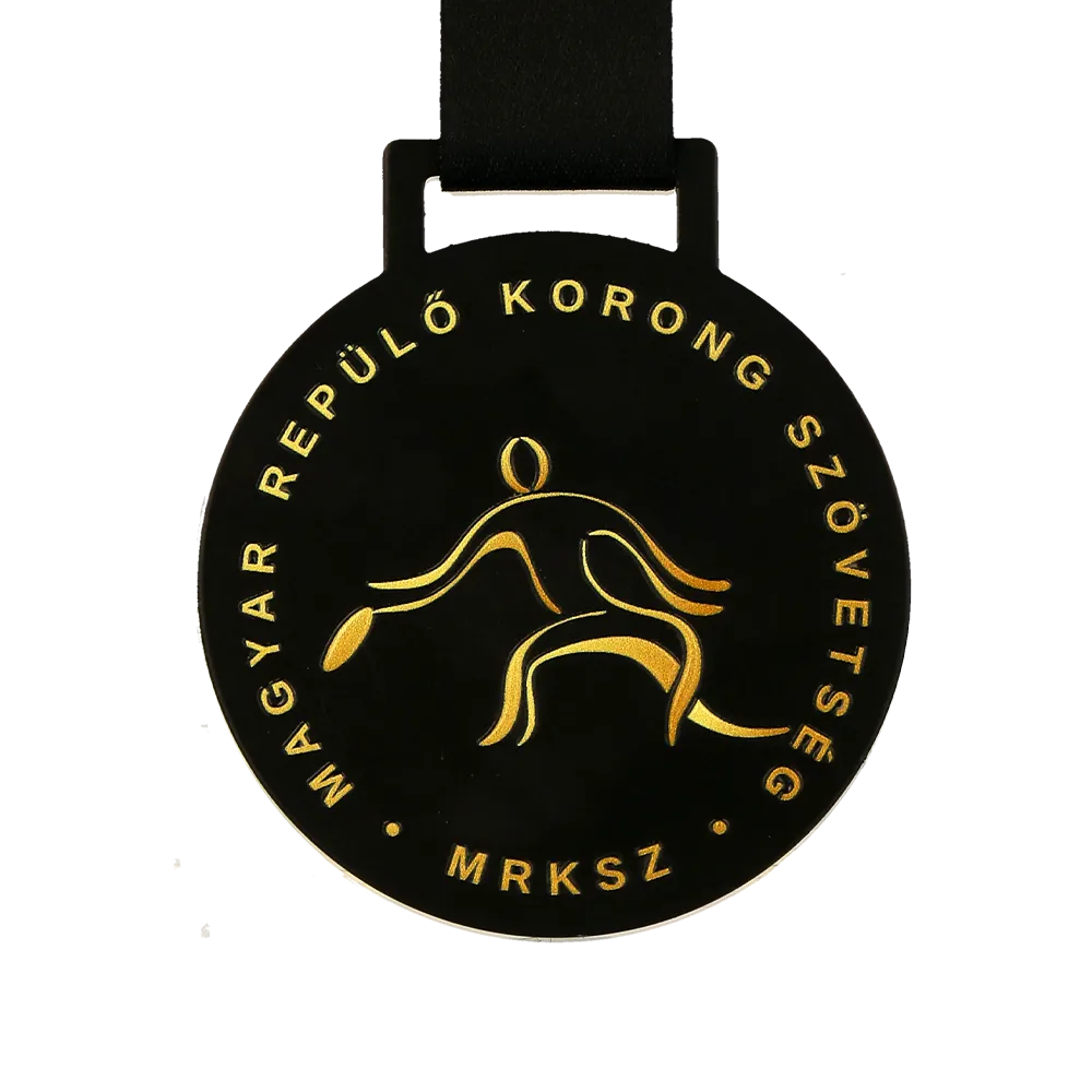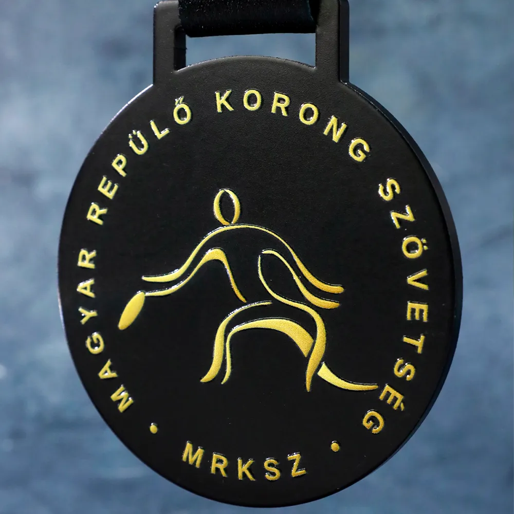A petición de la federación, hemos creado una medalla personalizada para las competiciones que organizan. Esta medalla es redonda, con fondo negro y elementos dorados. En el centro, hay una imagen dorada de una persona lanzando un frisbee. El texto alrededor del borde superior y en la parte inferior se ha realizado mediante impresión UV duradera. La medalla se completa con una cinta negra con el logotipo de la federación. El diseño es sencillo pero claro, encajando perfectamente con la naturaleza del deporte que representa.