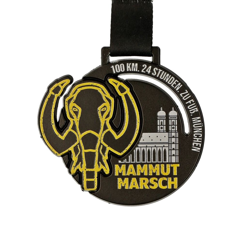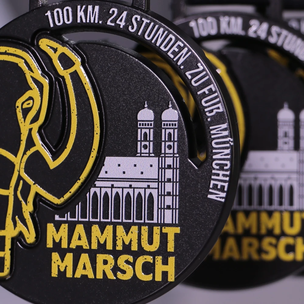Medallas deportivas elaboradas para el Mammutmarsch München, con impresión UV multicolor y un adorno dorado en forma de cabeza de mamut.