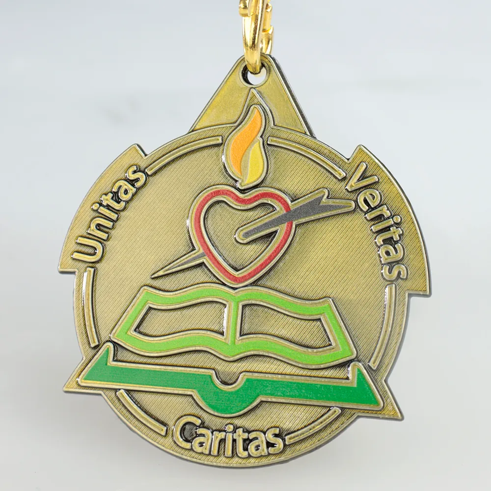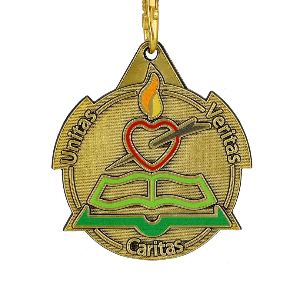 Una medalla personalizada para los participantes del Mark O'Brien College es un hermoso recuerdo para la escuela. La medalla presenta una llama sobre un corazón, simbolizando la pasión y el amor por el aprendizaje, con un libro abierto debajo, destacando el papel de la educación. Es una medalla fundida, lo que permite detalles precisos y una forma única. Los elementos en color se realizaron mediante impresión UV, dando a la medalla un aspecto atractivo.