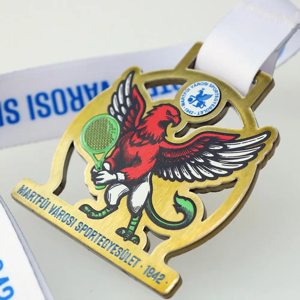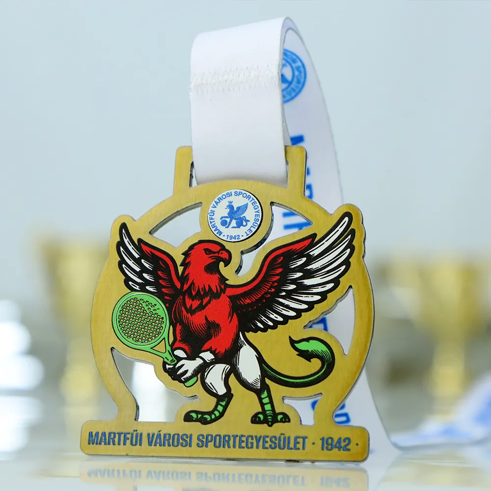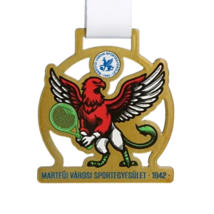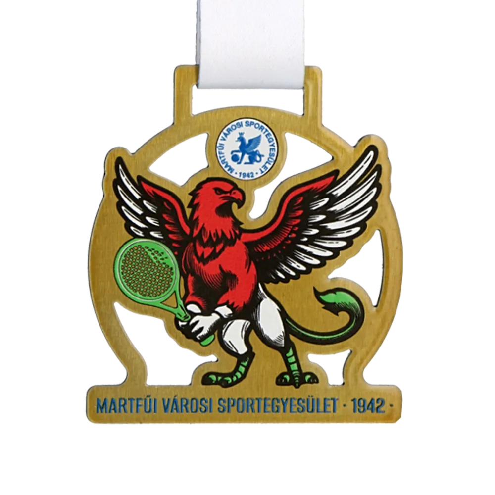 La medalla de acero del Martfűi Városi Sportegyesület ha sido fabricada en acero resistente como distinción especial para los aficionados al tenis. Mediante la técnica de impresión UV, se ha plasmado en el disco una dinámica figura de grifo que simboliza el espíritu combativo y la pasión de los participantes. Los calados aportan ligereza a la pieza, convirtiéndola en un elemento único en cualquier colección deportiva.