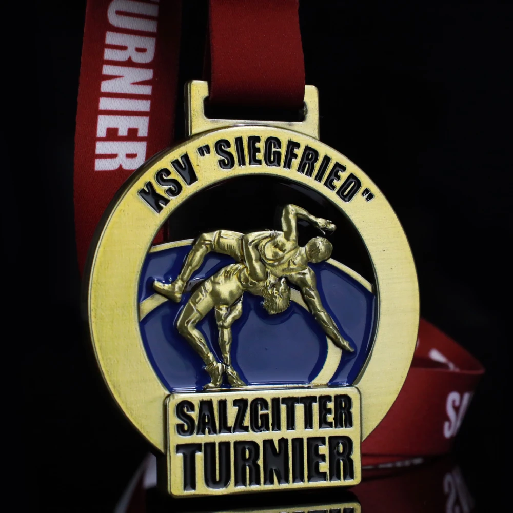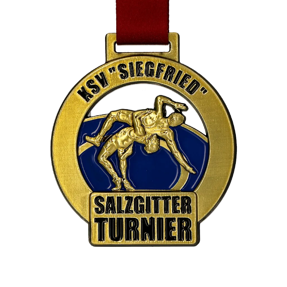 Nuestro último proyecto consiste en fabricar medallas fundidas únicas, especialmente diseñadas para los luchadores del Salzgitter Turnier. Las hemos realizado con materiales de la más alta calidad para garantizar su durabilidad. Además, estas medallas de oro combinan elegancia y dinamismo. Esto se aprecia en su forma redonda, adornada con recortes que aportan ligereza y carácter único. En el centro de la medalla hay un adorno tridimensional que representa a figuras en combate, símbolo de la competición y el valor característicos de los deportes de lucha. Todo esto se complementa con un esmalte azul marino que atrae la atención y resalta el carácter deportivo del evento.