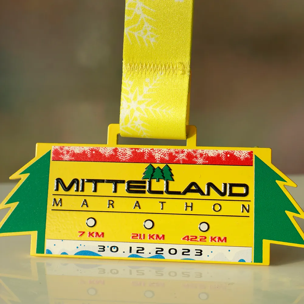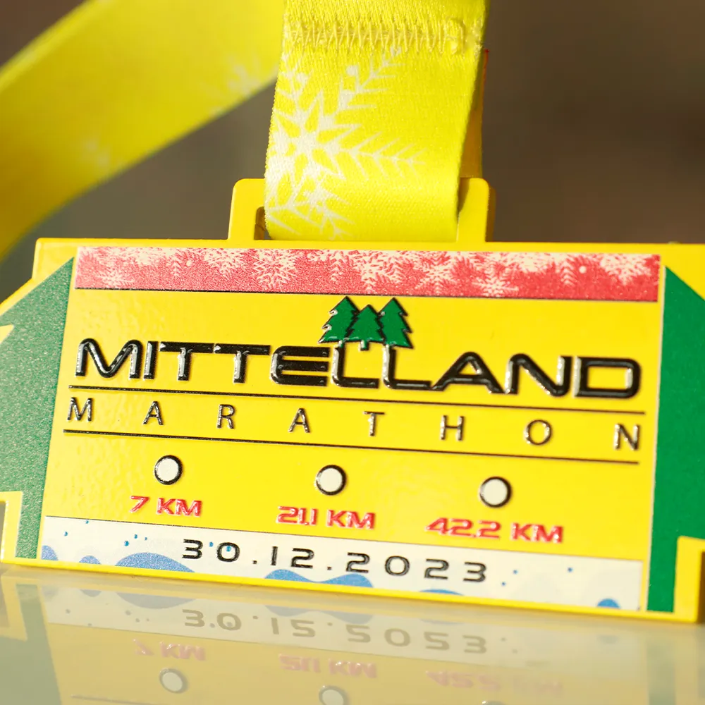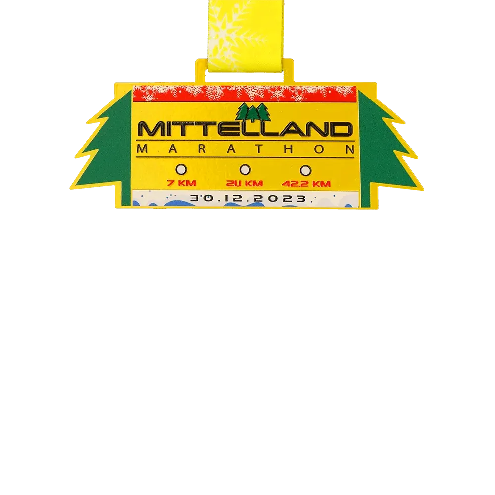 Una medalla personalizada de carrera creada para el Mittelland Marathon 2023. Es una medalla pintada de amarillo con impresión UV que incluye el nombre del evento, las distancias y la fecha.