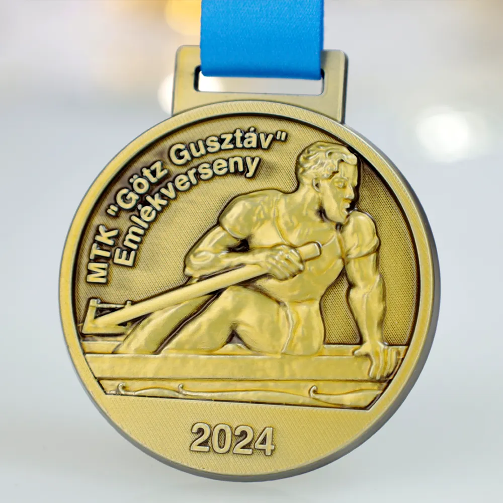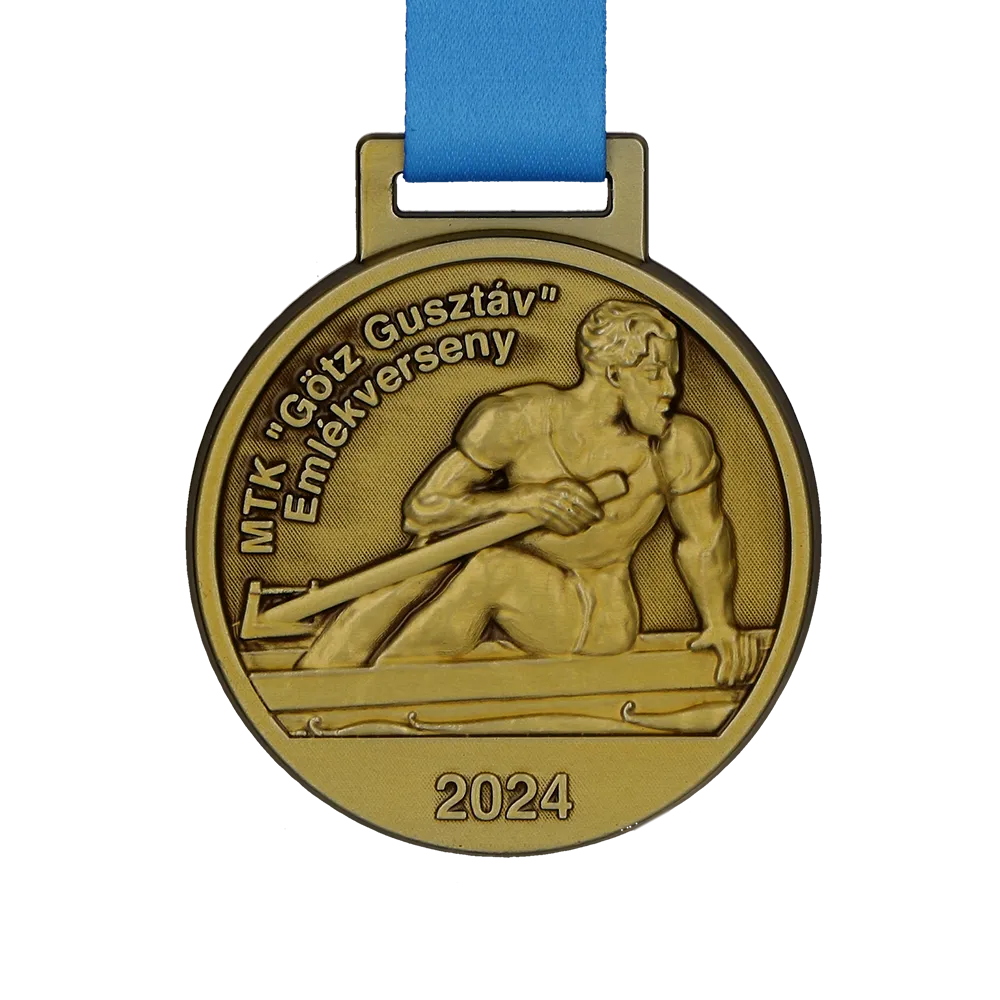 Unas medallas personalizadas doradas diseñadas para el evento conmemorativo de remo 'MTK Götz Gusztáv Emlékverseny 2024'. En el anverso aparece la imagen de un remero en una pose dinámica, capturando el espíritu deportivo del acontecimiento. Fabricadas en metal con acabado dorado, incluyen detalles sutiles y una inscripción con el nombre y el año del evento. Perfectas dla ocasiones deportivas de prestigio.