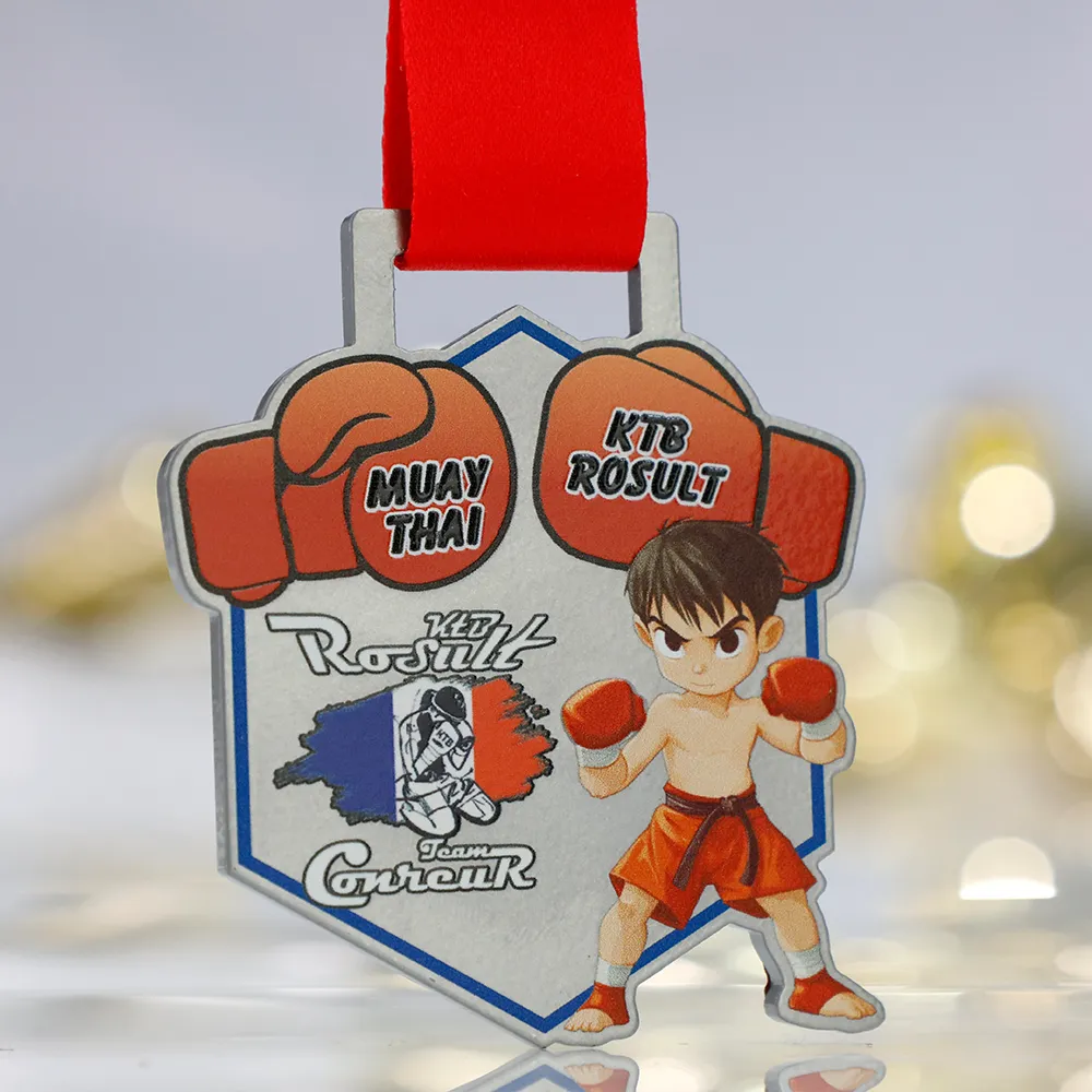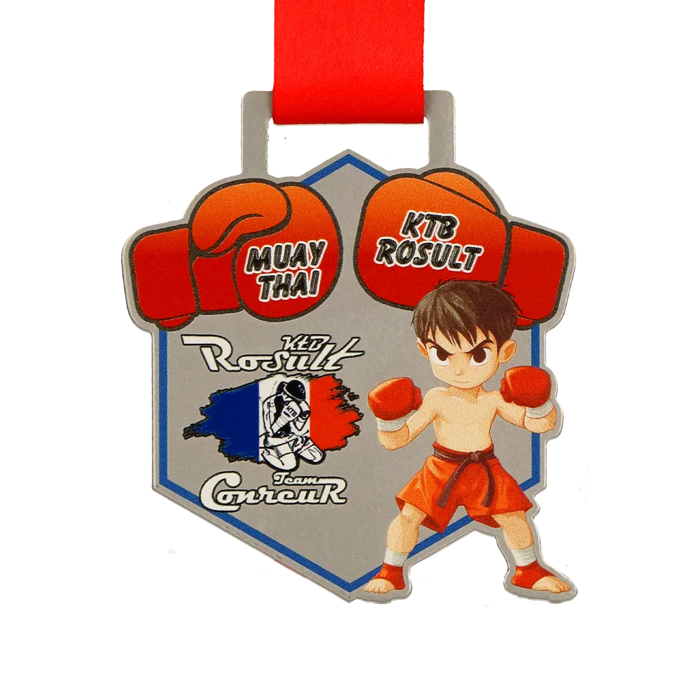 Unas medallas personalizadas creadas para una competición infantil de Muay Thai. El motivo gráfico muestra a un joven competidor de boxeo y unos grandes guantes rojos. La impresión UV garantiza colores vivos. La personalización incluye el nombre del club y el deporte. La medalla está unida a una cinta roja.
