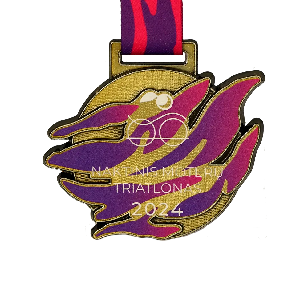 La medalla personalizada de triatlón para Naktinis Triatlonas 2024 es una excelente combinación de tradición y modernidad. Esta medalla fundida tiene una forma dinámica y única, y gracias a los adornos de colores realizados con impresión UV, presenta colores vivos y duraderos.