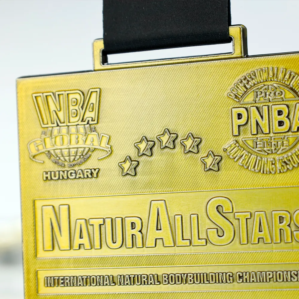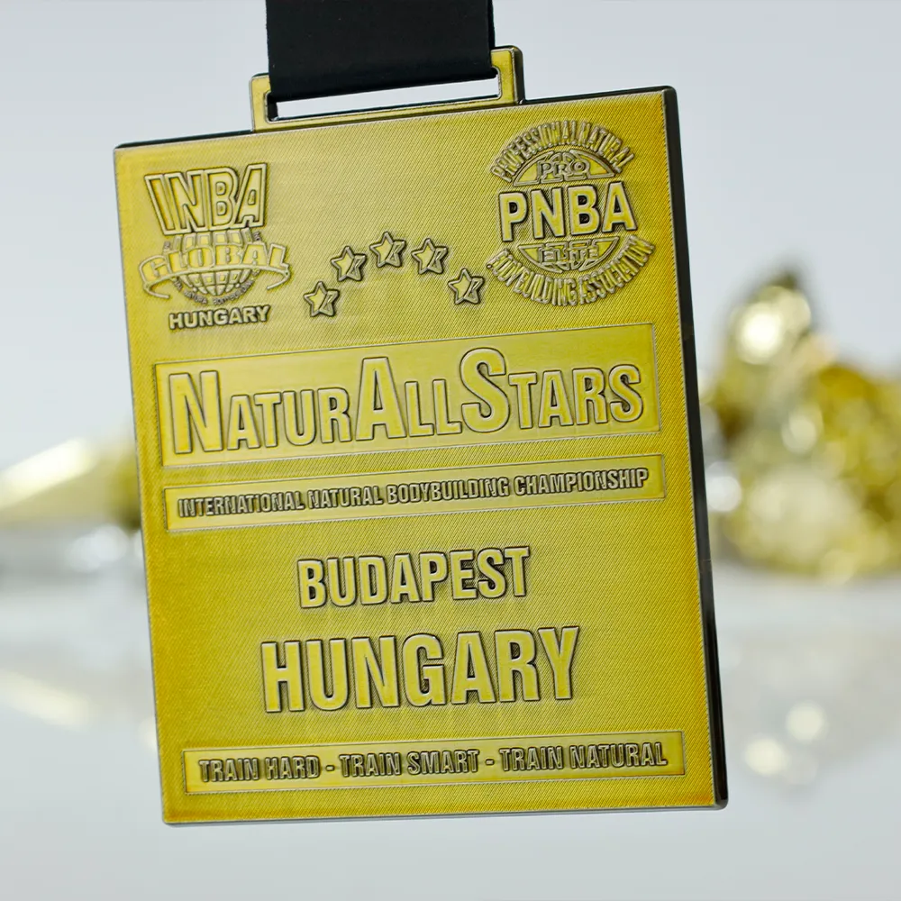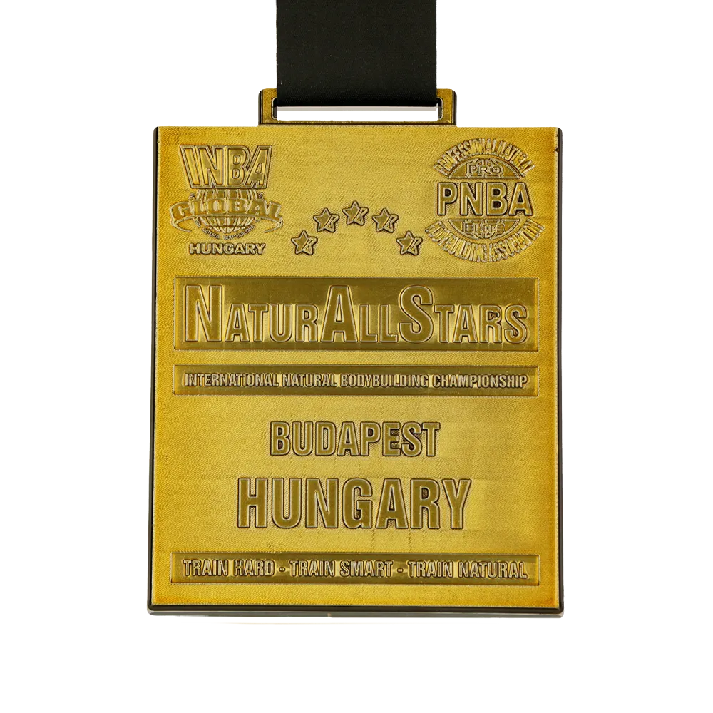La medalla fundida se realizó para la competición internacional Natural Allstars International Natural Bodybuilding Championship en Budapest (Hungría). Tiene un formato rectangular y un acabado dorado.