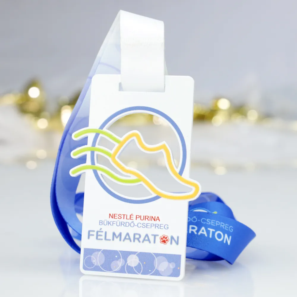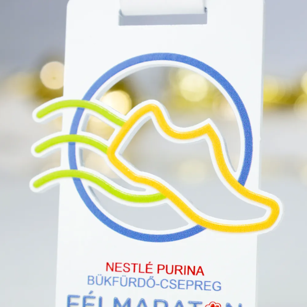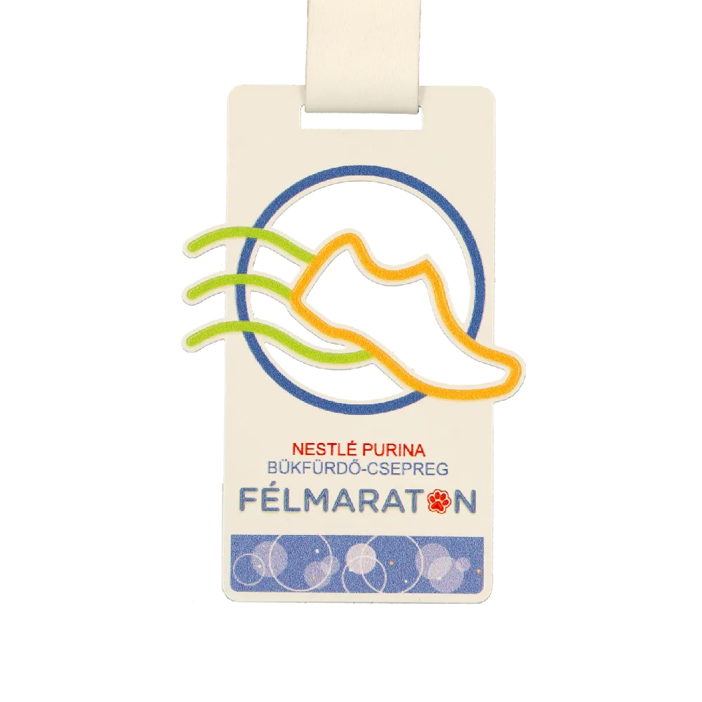 Una medalla personalizada rectangular creada para el evento 'Nestlé Purina Félmaraton Bükfürdő-Csepreg'. En el frente aparece un gráfico colorido con la silueta de una zapatilla de correr sobre un fondo circular, junto con los logotipos de los patrocinadores. El fondo claro y el diseño minimalista enfatizan el estilo moderno del premio, lo que la hace ideal para medio maratones y eventos que promueven la actividad física.