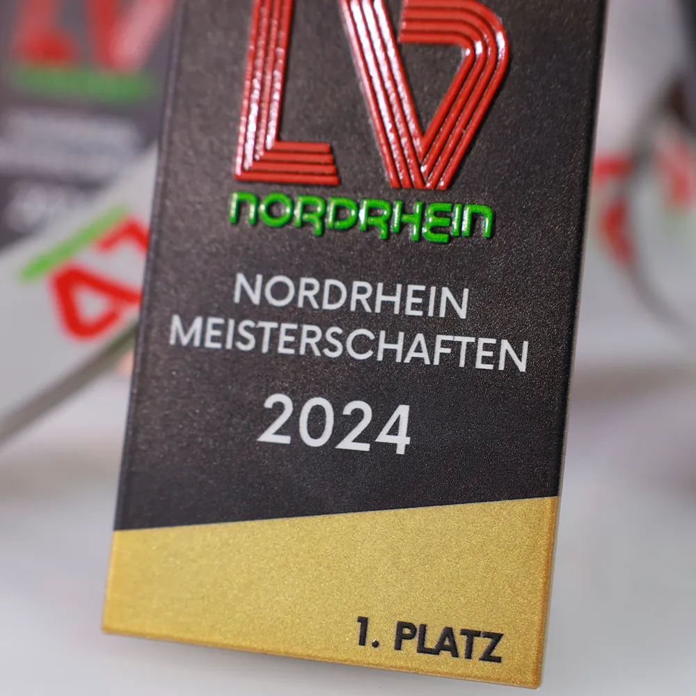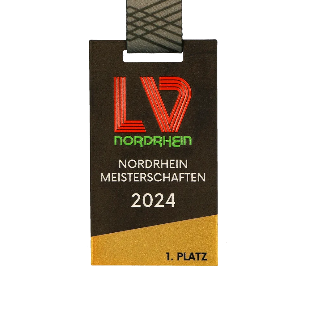 Presentamos nuestra medalla personalizada diseñada específicamente para el evento Nordrhein Meisterschaften 2024. Esta medalla rectangular de metal combina durabilidad y sencillez. Incluye un logotipo claro y textos grabados. El uso de colores suaves y detalles precisos le da una apariencia elegante.