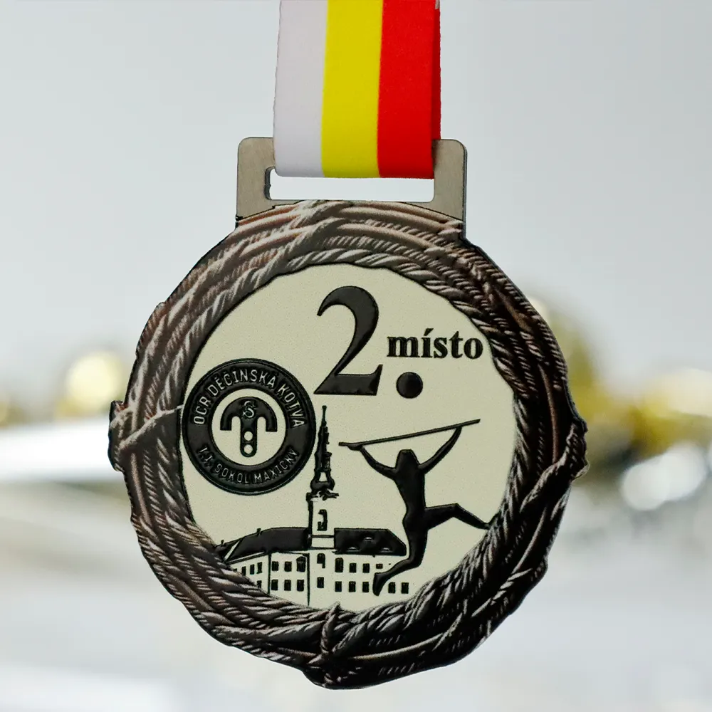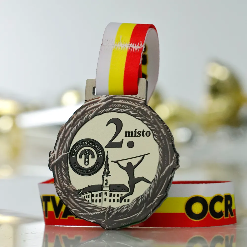 Medalla de acero otorgada por el 2º lugar en la competencia OCR Decinska Kotva. La medalla está hecha de metal plateado con impresión UV negra. El anverso presenta la silueta de un atleta frente a un edificio y el logotipo del evento, todo rodeado por un motivo de cuerda. Técnica: acero con impresión UV.