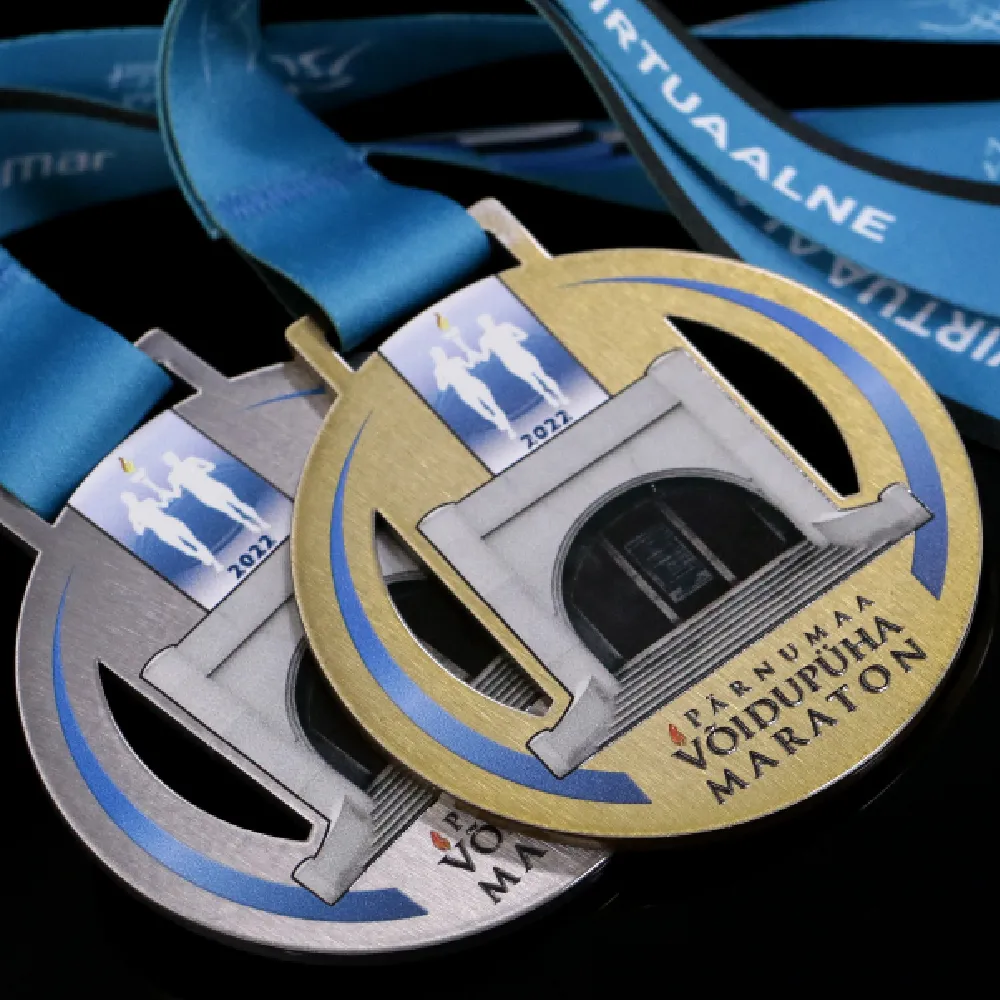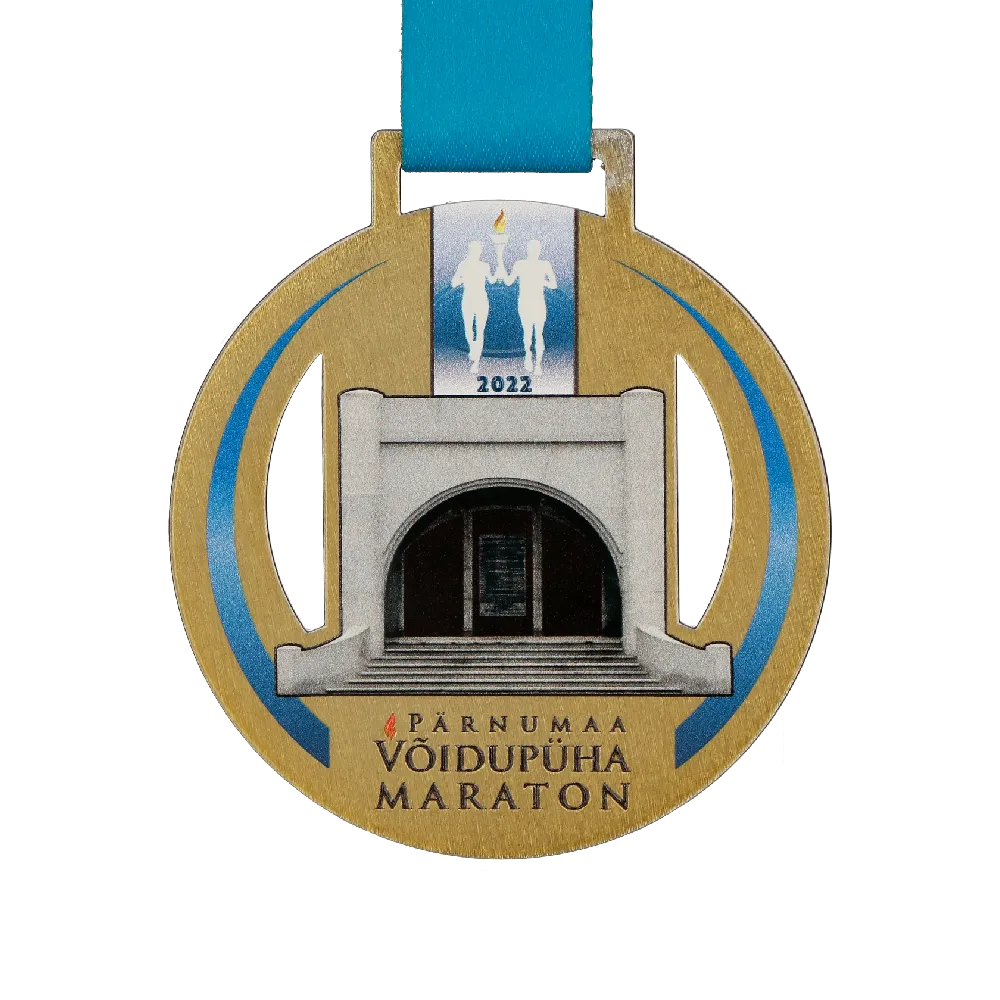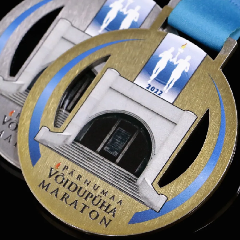 En las competiciones deportivas, normalmente los ganadores de los tres primeros puestos son los más distinguidos. Sus logros se reconocen con premios adecuados, que deben estar a la altura del rango de la victoria obtenida. Por eso, para el Parnumaa Voidupuha Marathon 2022 preparamos medallas de acero en tres versiones de color: oro para el ganador del primer puesto, plata para el segundo y bronce para el tercero. Las medallas tienen forma redonda, enriquecida con recortes simétricos en su interior. Todo el conjunto está cubierto con una impresión a color que resalta perfectamente la decoración situada en la parte central de la medalla. Gracias a ello, estas medallas para carrera realzan aún más los logros de cada atleta.