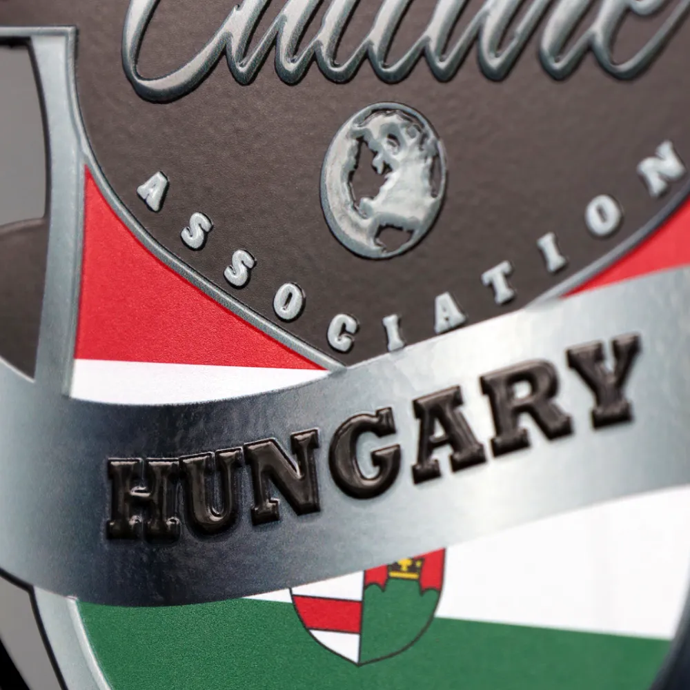 Nuestras medallas de acero inoxidable creadas para PCA Hungary tienen forma redonda y presentan aberturas caladas que forman el logotipo del organizador. Las hemos realzado con impresión UV a color, otorgándoles un carácter distintivo sobre el fondo negro. Es importante destacar que las decoraciones de las medallas rinden homenaje a Hungría y al culturismo, mostrando respeto por la tradición y pasión por el deporte. Las medallas personalizadas son grandes, lo que enfatiza la importancia de los logros de los atletas. Además, están suspendidas en una cinta de sublimación, lo que aporta elegancia al diseño general. La combinación de tradición y deporte simboliza fuerza, determinación y perseverancia.