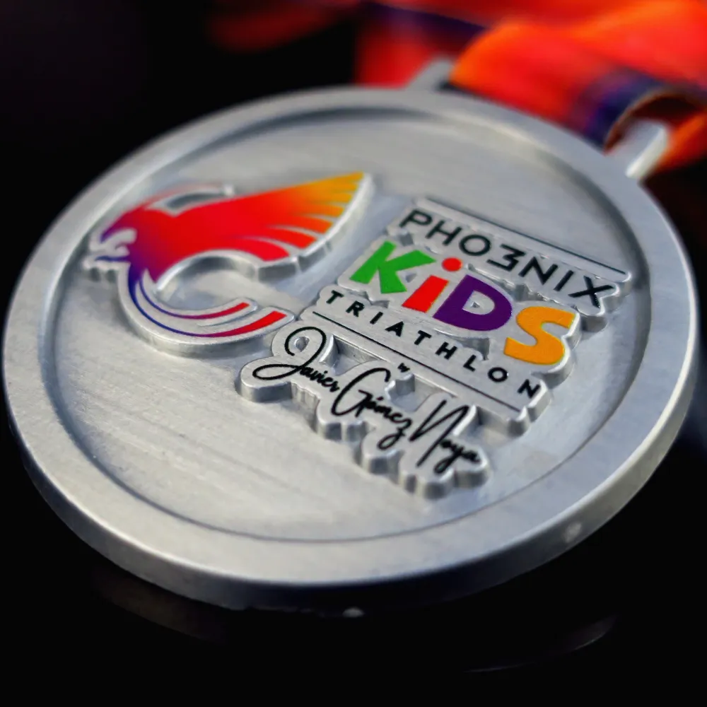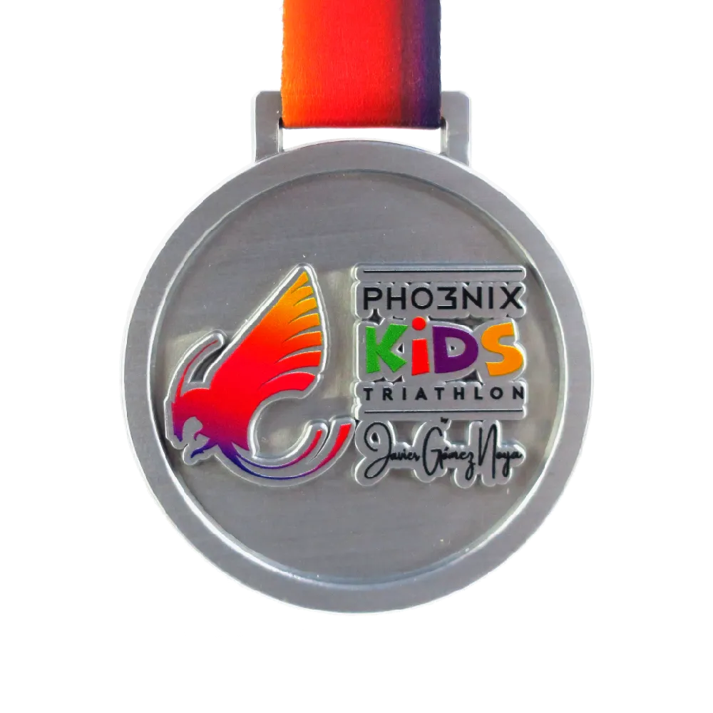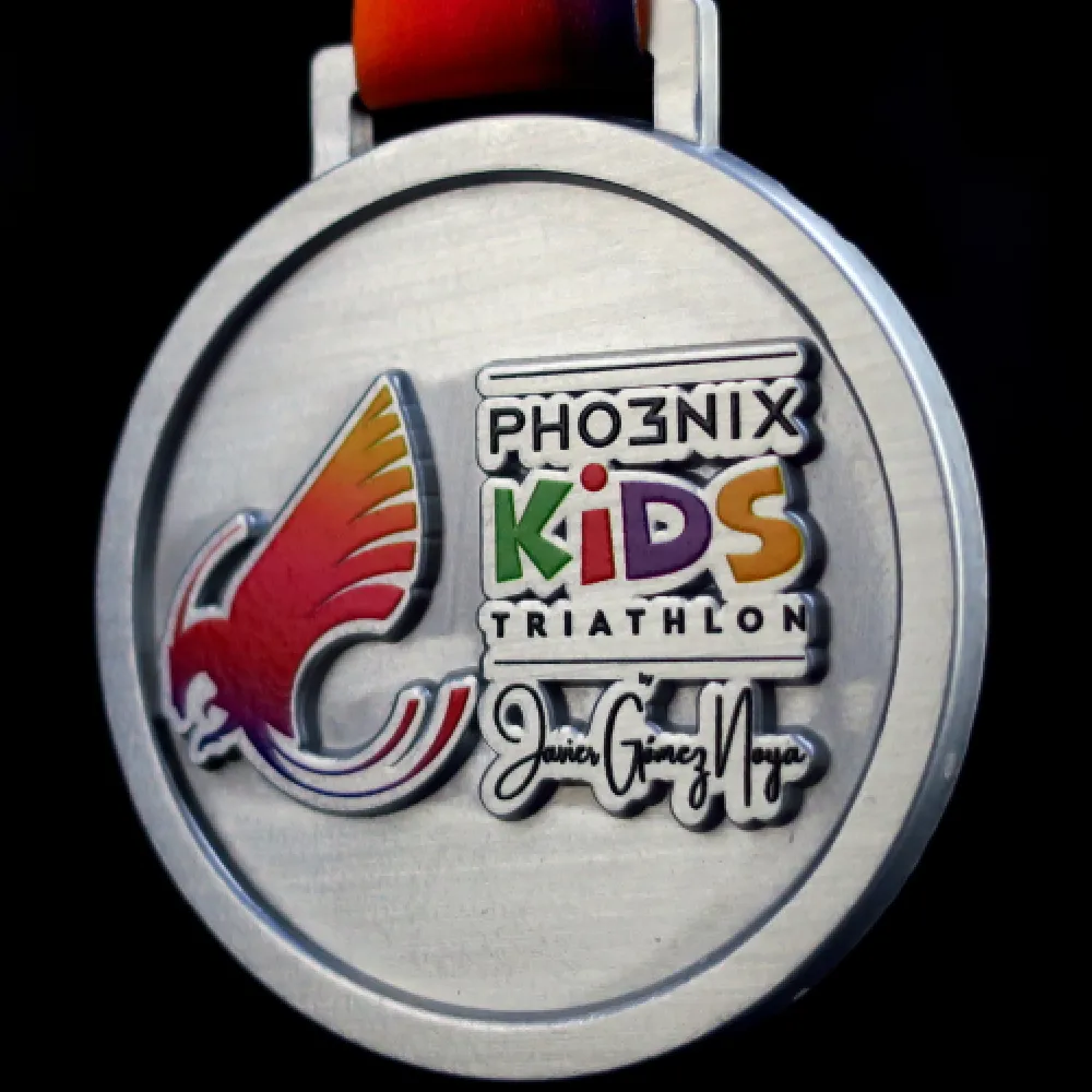 La característica común de toda competición deportiva son los premios. El tipo más popular son las medallas, que creamos en Winmed por encargo individual. Uno de nuestros proyectos únicos son las medallas fundidas impresas preparadas para el Phoenix Kids Triathlon. Las medallas de triatlón tienen forma redonda y color plateado, y su superficie brilla suavemente con la luz. Además, en la parte central de la medalla hay una impresión a color con el logotipo del organizador y el nombre del evento. Gracias a los colores expresivos de estas decoraciones, el conjunto resulta llamativo y memorable, haciendo que los participantes recuerden durante más tiempo el éxito logrado en la competición.