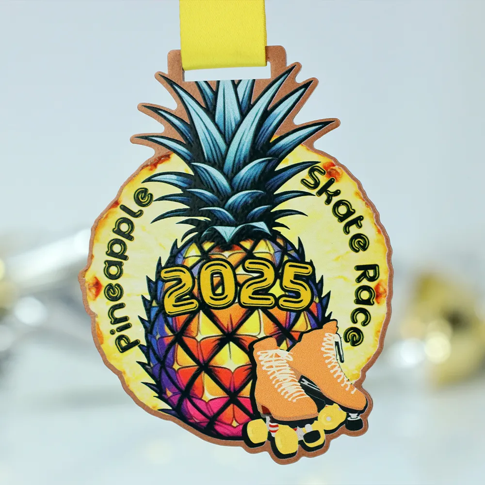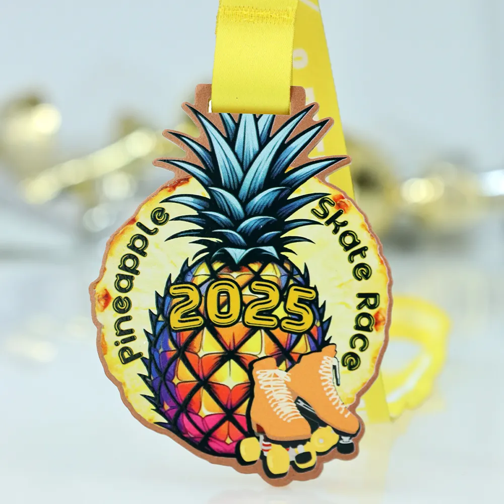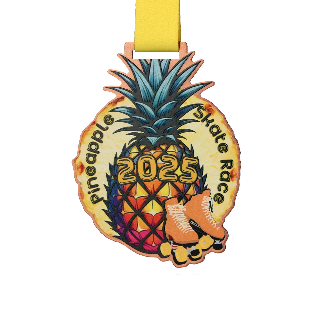 Estas medallas de acero preparadas para la Pineapple Skate Race 2025 destacan por su forma precisa e irregular que recuerda a una piña con su característica corona verde. Gracias al uso de la moderna tecnología de impresión UV, logramos obtener colores extremadamente saturados y detalles como la textura de la fruta, palmeras al fondo o la silueta dinámica de un patinador.
