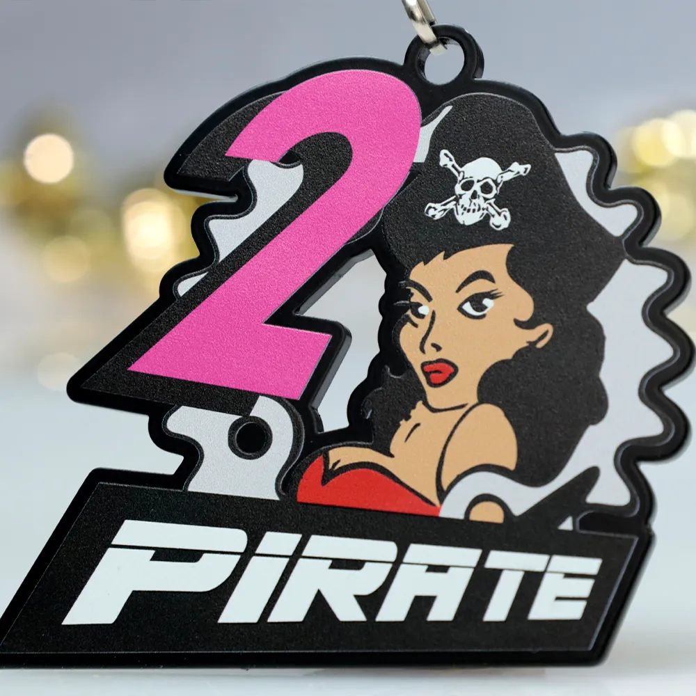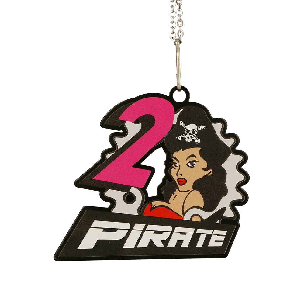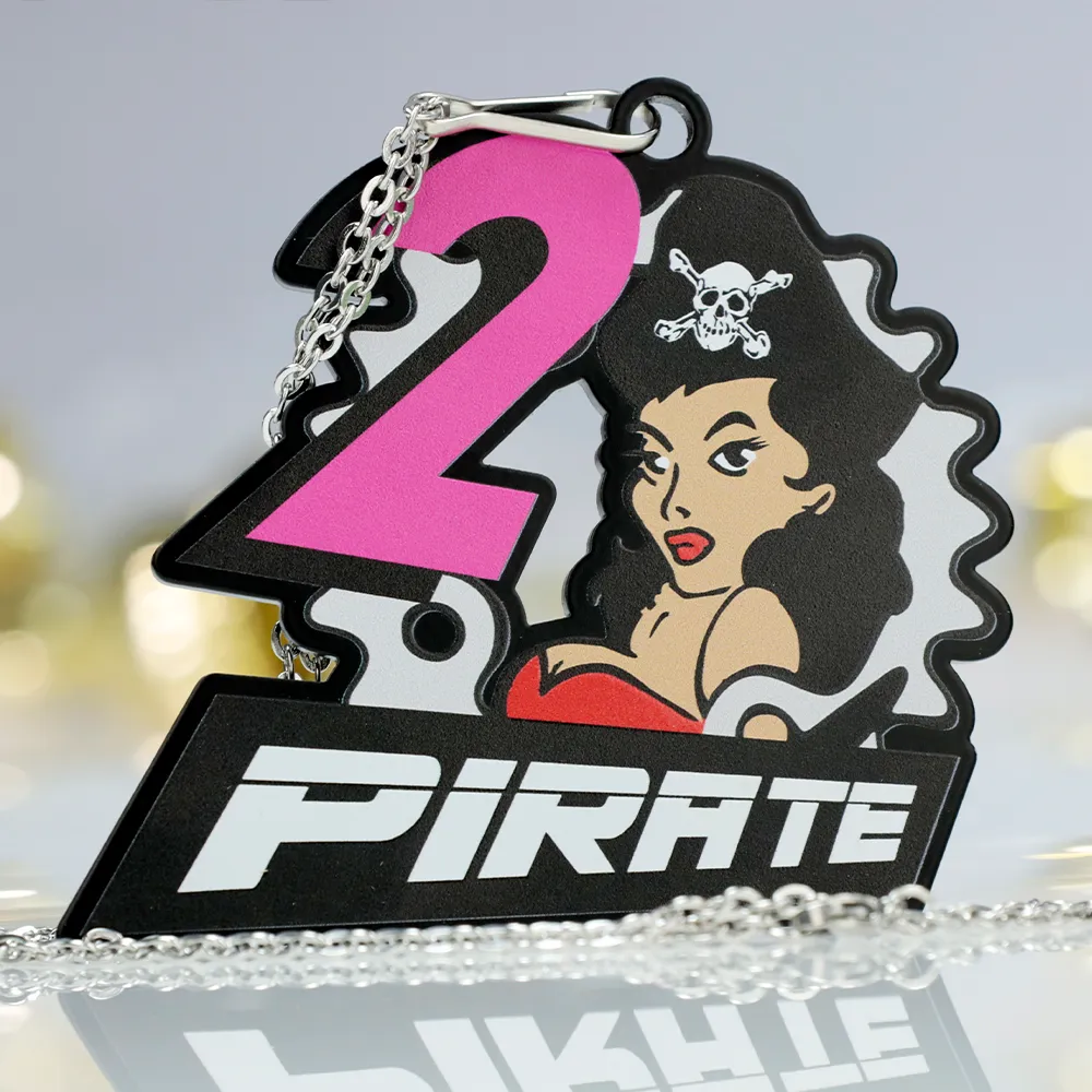 Una medalla personalizada con forma del número '2', diseñada para un evento con temática pirata. El elemento central es una pirata con un pañuelo decorado con una calavera y huesos cruzados. La medalla se distingue por colores vivos como rosa, negro y blanco, con una tipografía dinámica que incluye la palabra 'Pirate' para enfatizar la temática. Está suspendida en una cadena metálica, lo que le da un carácter único.