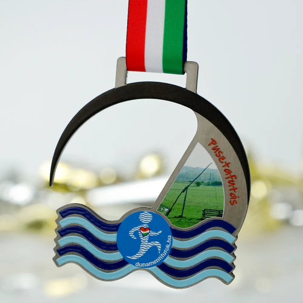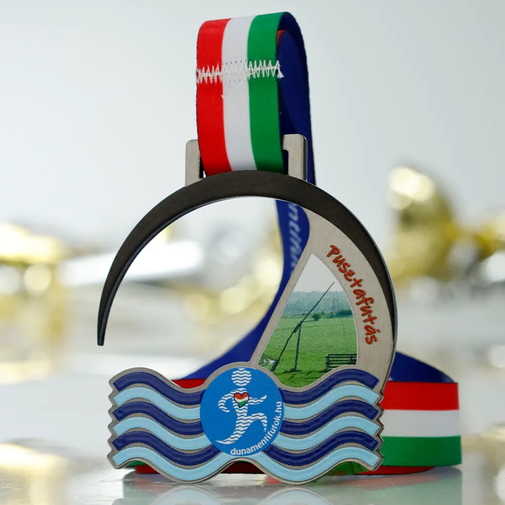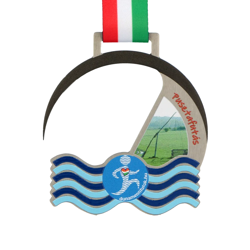 Esta medalla de running se diseñó para la carrera Pusztafutás, organizada por Dunamentifutok.hu. El contorno, cortado por láser, combina dos elementos principales: una parte superior negra en semicírculo y una parte inferior con ondas azules. En el interior, una impresión UV representa la puszta húngara y el logotipo de la prueba.